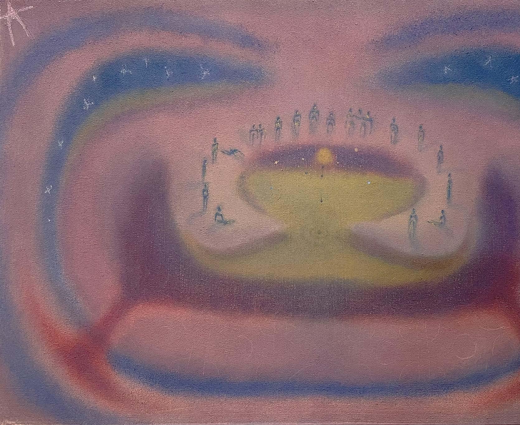 “Midnight Circus” 2021 Oil and oil pastel on canvas 18 x 28 x 1.5 in