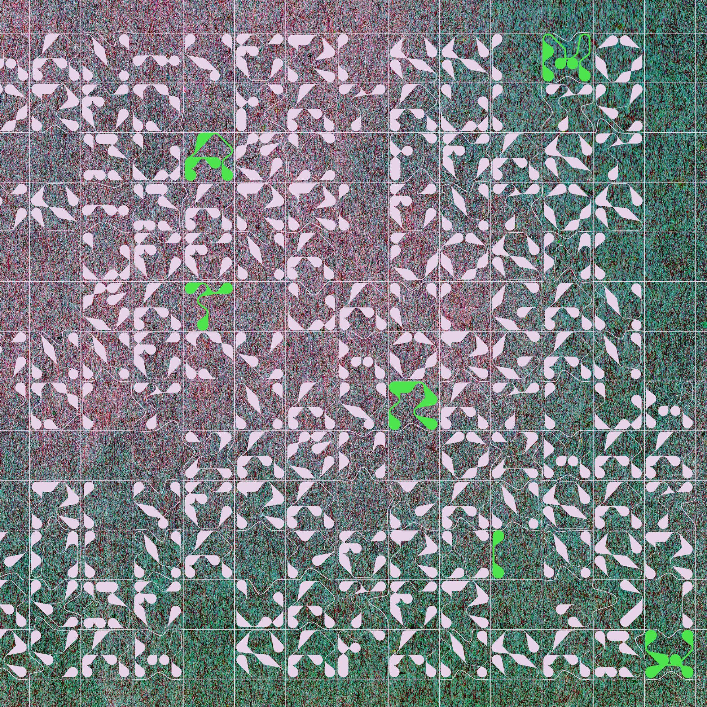 “GMP X 374” 2021 Aluminum eyelet, steel jump rings, photo prints 60 x 60 in.