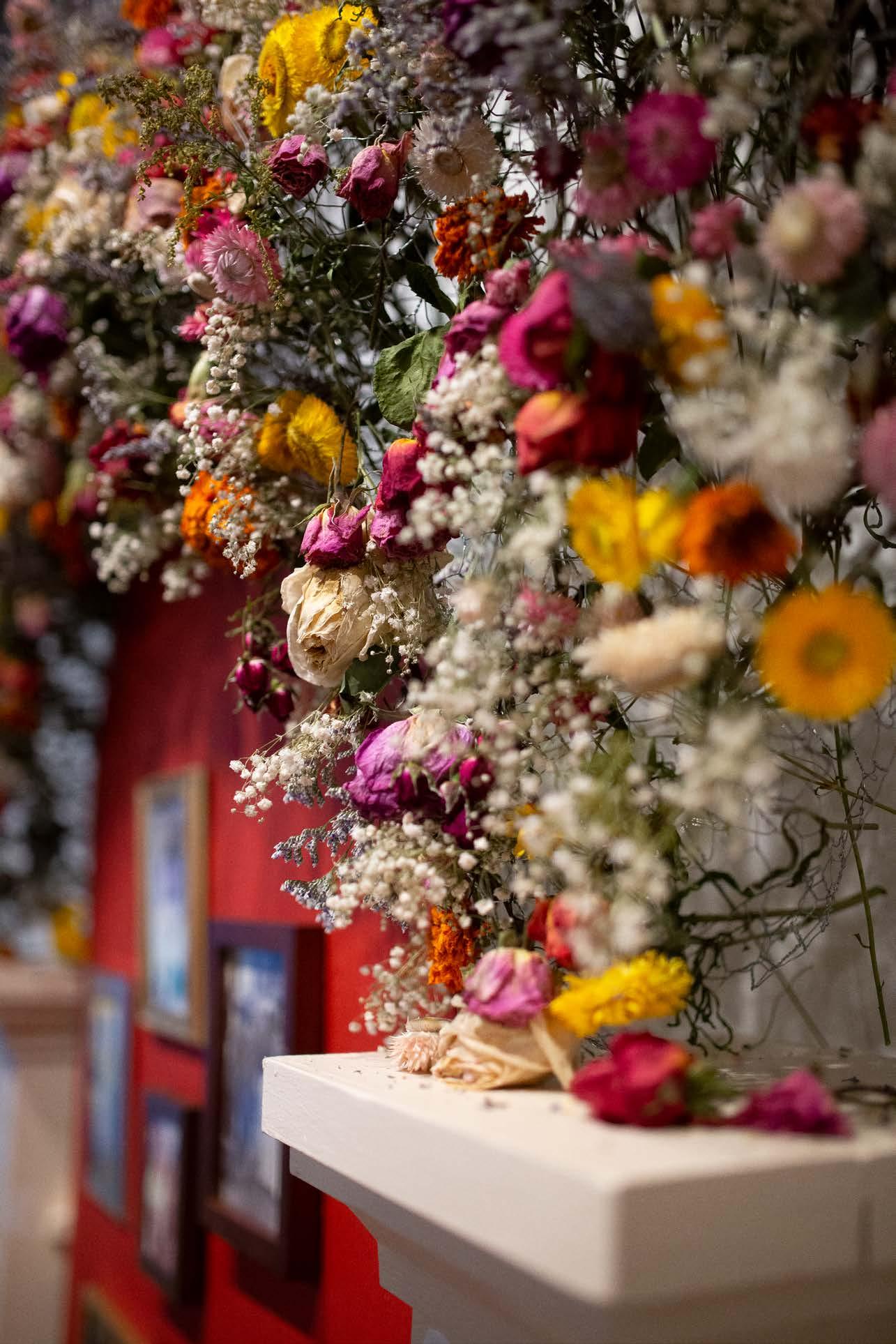 “Altar of Black Life” 2020 Plywood, acrylic paint, framed photographs of those loved dearly, flowers, fruit, candles 96 x 60 x 12 in.