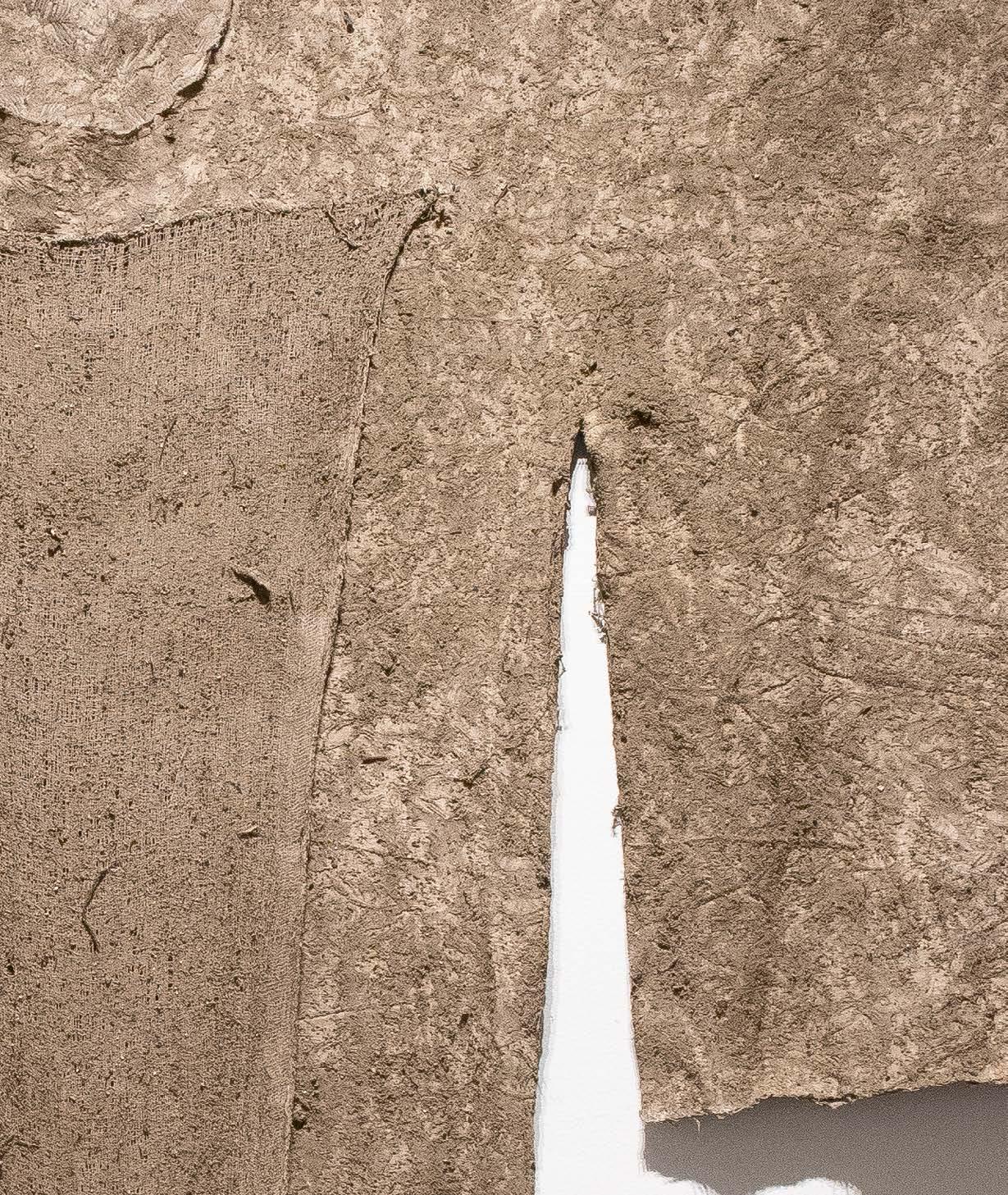 “Pakikipagkapwa (of terra, of aether)” 2022 Mud soaked garment made from recycled textiles 60 x 40 in.