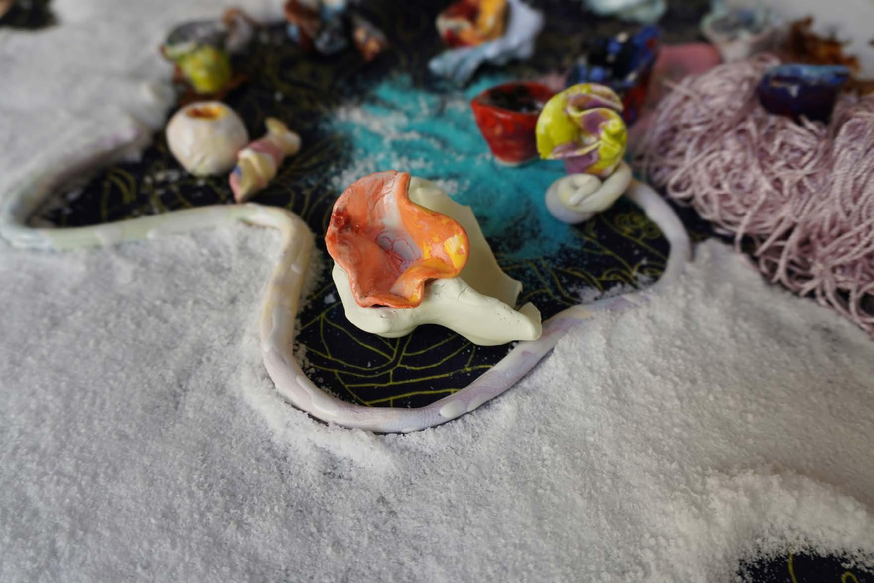 In Shape of Belonging, Sun Park offers us a new iteration of a performance for Introductions involving a ritual created for people who have left a religious community or who have had a major shift in their relationship with their religious community. An open call ahead of the exhibition invited participants to respond to poetic prompts, and guided by their answers the artist made a small cup for each person to drink a small sip of a special drink of their choice at the opening reception. Park invites participants to consider how it feels to detach from community, and to find a new sense of belonging. While this new iteration of the performance was premiered at the opening reception, a trace of the performance remains behind in the form of the