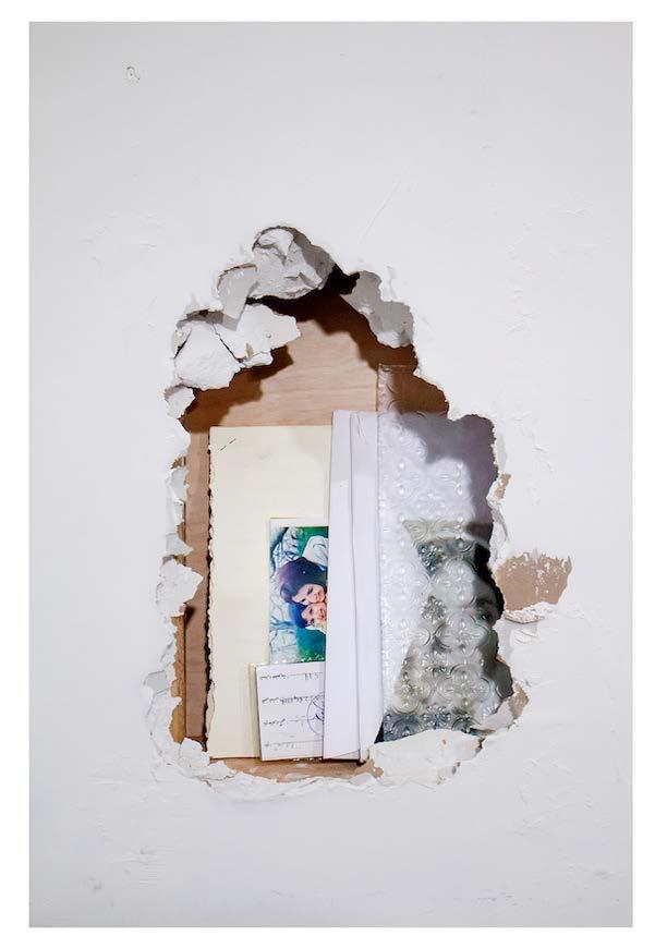 Reflecting on similar themes, Helia Pouyanfar’s architectural sculptures explore the permanently transient state of the refugee body. The artist reflects on her experience as an asylum seeker, poignantly flipping the narrative by placing meaning in the physical structures that make up a home, and making these components transportable. A piece of wall is turned into a backpack, with photos and memorabilia peeking out from inside. A door is put onto wheels, through which one can walk while also taking it from place to place. A tiled bathroom wall with a pipe poking out sits on the floor in the shape of a briefcase with a handle, while a portion of a brick wall sits on wheels with a suitcase handle. All these house structures have wheels and handles so they can quickly be picked up and taken at a moment’s notice.