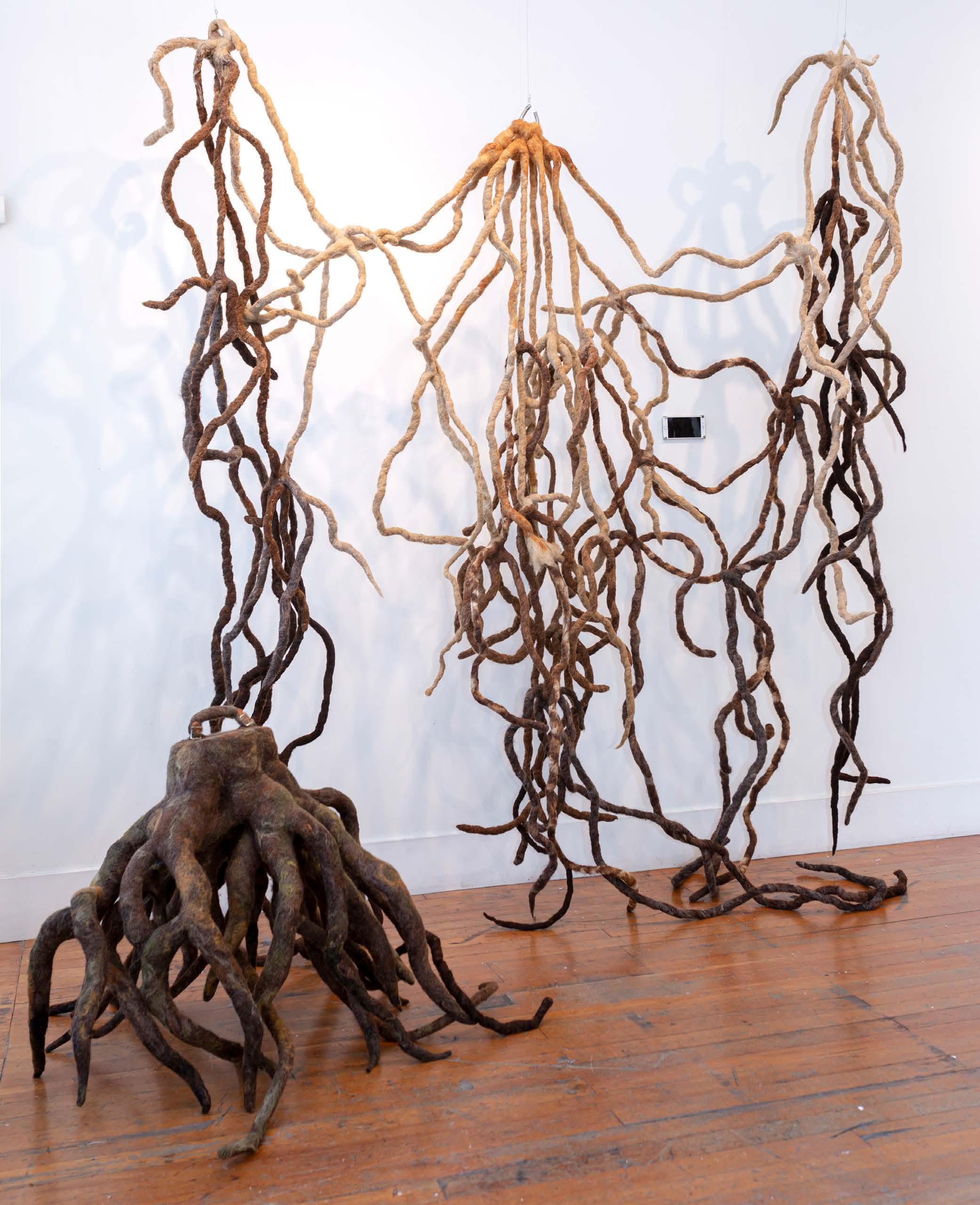 Claudia Huenchuleo Paquien’s intricate woven installation hangs from the ceiling, with light casting an interlaced shadow counterpart behind it. Each tendril is painstakingly woven by hand using sheep’s wool dyed with plants and trees from the archipelago of Chiloé in Chile. The interconnected tendrils allude to root systems, inspired by the metaphor of the tree and the rhizome connected to their surroundings. A tree stump with woven roots and a suitcase handle speaks of grounding, of “home” as something transportable, and of the ability to put down roots in new places. By creating these interconnected