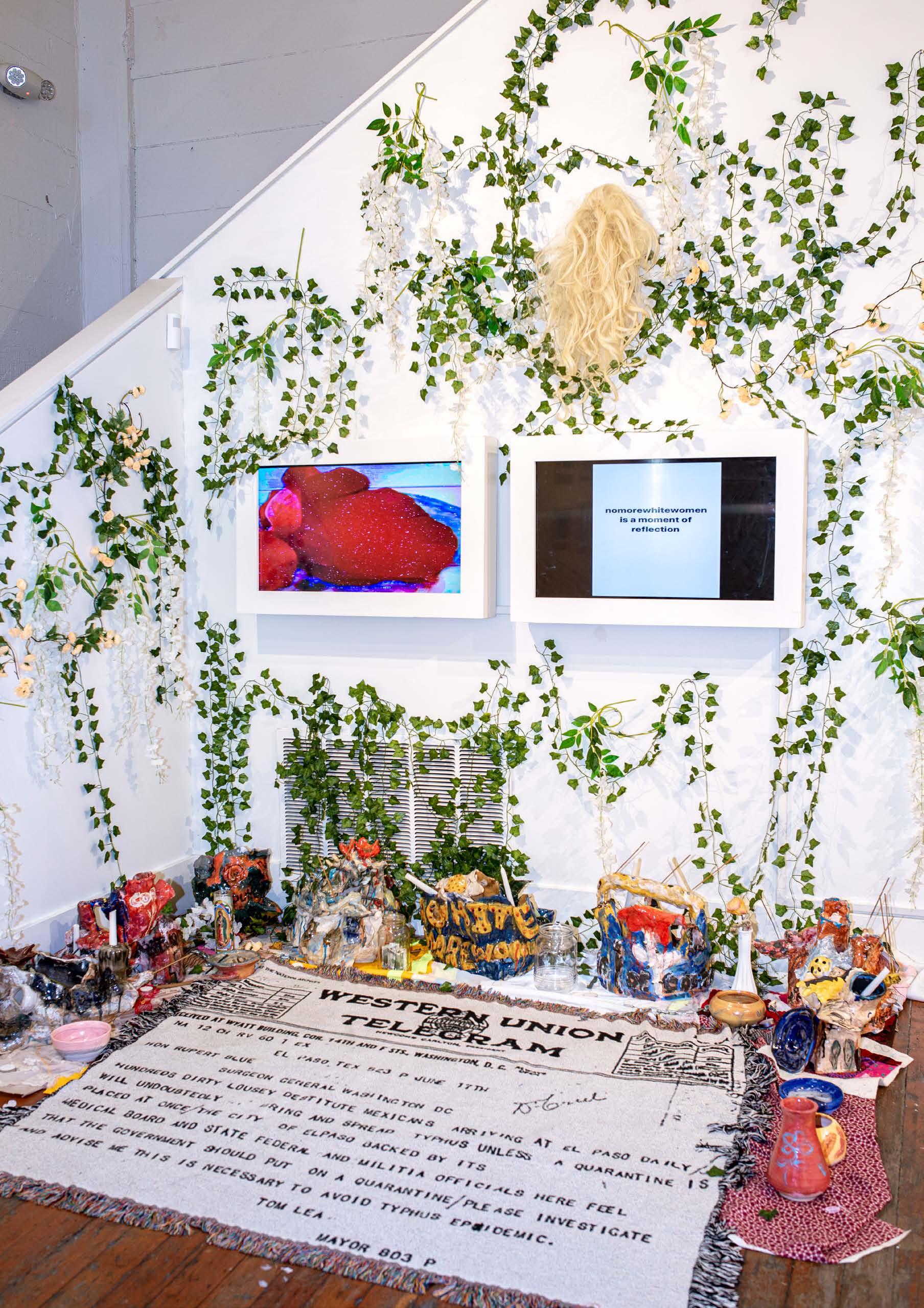 border into the United States refused to submit to offensive immigration policies that included “delousing” “sanitizing” and “disinfecting” the migrants. Viewers are invited to sit on the blanket in front of two monitors which are framed by plastic vines and flowers, and watch Saucedo’s videos; digital dream-like, autobiographical, video journals that touch on themes of power, bondage, and love. Saucedo’s commitment to decolonize their romantic preferences has led to a commitment in art and life to renegotiate their relationship to whiteness, and white women in particular.
