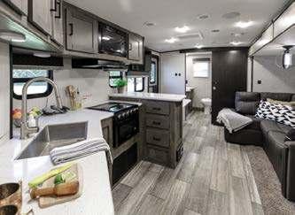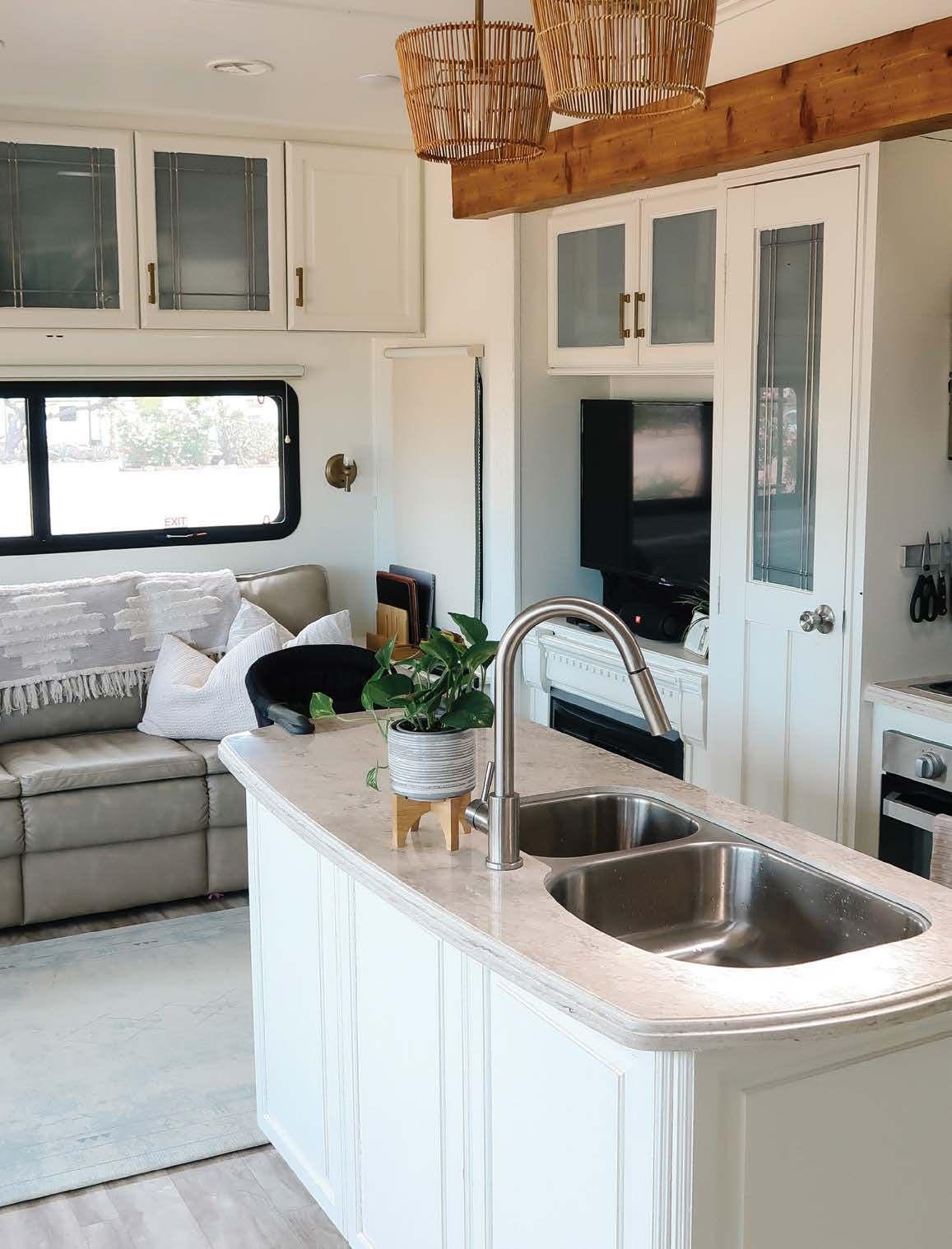 When we ordered our fifth wheel from Grand Design, I knew the first step was to brighten it up by painting everything — and I do mean everything!Wepaintedallofthewalls,doorsand the ceilings Simply White by Benjamin Moore and the cabinets Swiss Coffee by Benjamin Moore and Grays Harbor by Sherwin Williams. Daniel and I painted non-stop for 3 days before we finally called it quits and hired a painter to finish up the cabinets and ceilings. While the painters finished up, we jumped back into renovations by constructing two hollow cedar beams that run the length of our living room and kitchen. The natural wood warms the space and was the “finishing touch” of the renovation that really made our RV feel like home. After just two weeks of painting and hanging beams, we officially moved in!