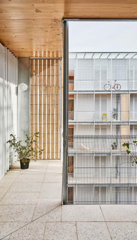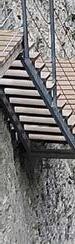 Sobre las ménsulas se apoyan dos largue ros de madera de pino silvestre, aserrada y tratada en autoclave para una protección cali ficada NP5, clase de uso 4 y resistencia C18C24, fijados a placas metálicas galvanizadas y tornillería de calidad 8.8. Finalmente, el tablero se resuelve mediante tablas de made ra tratada separadas entre sí entre 4 o 5 cen tímetros, lo que contribuye tanto a aligerar el conjunto como a permitir una experiencia visual intensa sobre el vacío. Esta decisión, lejos de ser puramente estética, reduce no tablemente la acción del viento y facilita la evacuación de agua y el arrastre de material, prolongando la durabilidad del sistema. En posteriores ampliaciones del reco rrido de la pasarela, se adoptaron esca leras de estructura metálica y huella de madera para salvar las irregularidades del terreno y adentrándonos más si cabe en las entrañas del estrecho. Además, se instaló un segundo mirador.