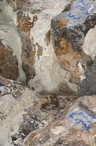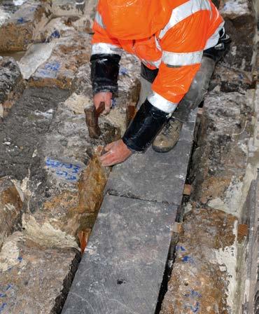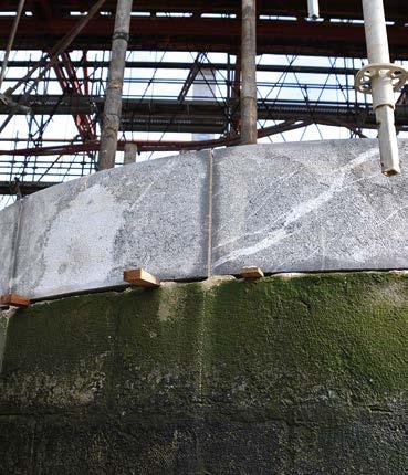 adoptaron medidas específicas destinadas a evitar la caída accidental de estos fragmen tos al vacío; y, en caso de producirse alguna incidencia, el equipo accedía hasta el fondo del barranco para recuperar cualquier pieza desprendida, evitando así impactos sobre el entorno y manteniendo un control riguroso de los residuos generados, que eran retirados diariamente; de este modo se mantenía un orden excepcional en un espacio de cons trucción muy reducido que cada día se aleja ba más del punto de inicio.