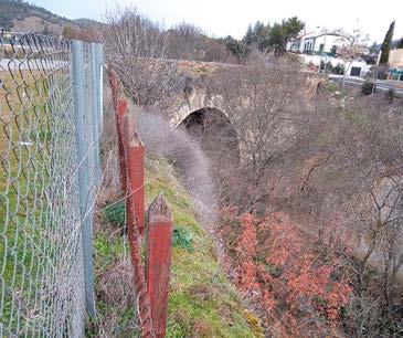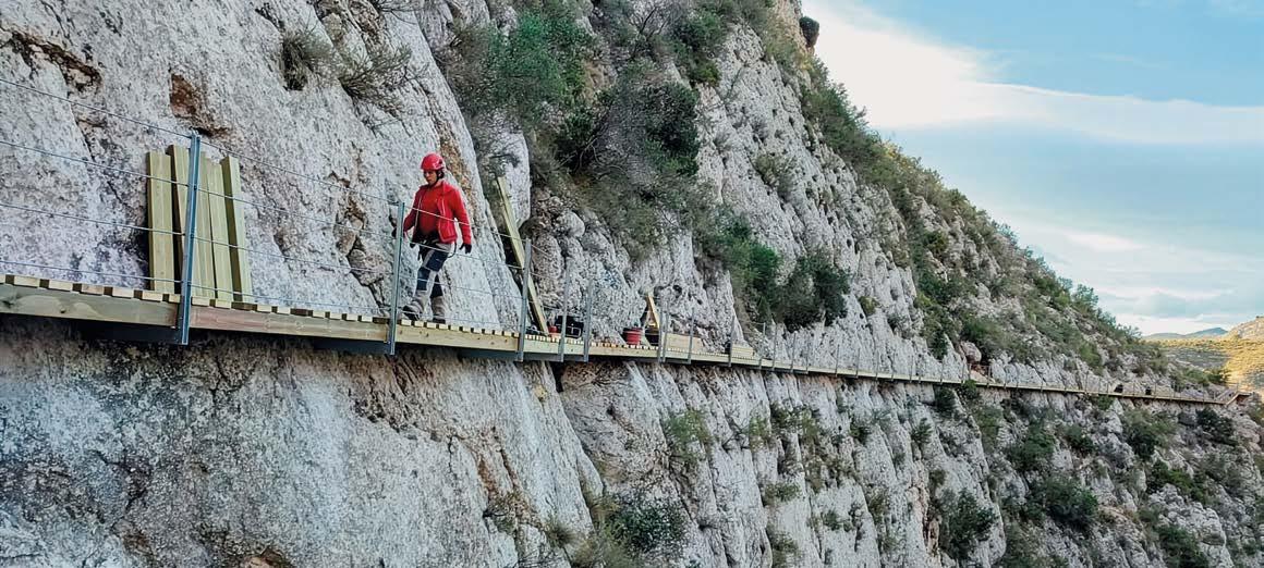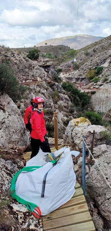 Un proyecto condicionado por la logística vertical El principal reto de la intervención no fue únicamente el diseño de la estructura, sino la logística asociada a su construcción. El acceso al frente de trabajo era prácticamente inexistente, y el desnivel con el lecho del ba rranco y los puntos de instalación superaba los 60 metros en vertical. Durante las primeras fases, todo el material —incluidos perfiles metálicos, barandillas, resinas, maderas, herramientas y elementos de seguridad— tuvieron que transportarse manualmente a lo largo de las paredes verti cales mediante sistemas de poleas y cuerdas. Cada elemento tuvo que ser previamente di mensionado no solo desde el punto de vista estructural, sino también para su manipula ción en condiciones extremadamente restric tivas, pues debemos recordar que tampoco existe acceso en vehículo rodado a un punto cercano al inicio de la pasarela.