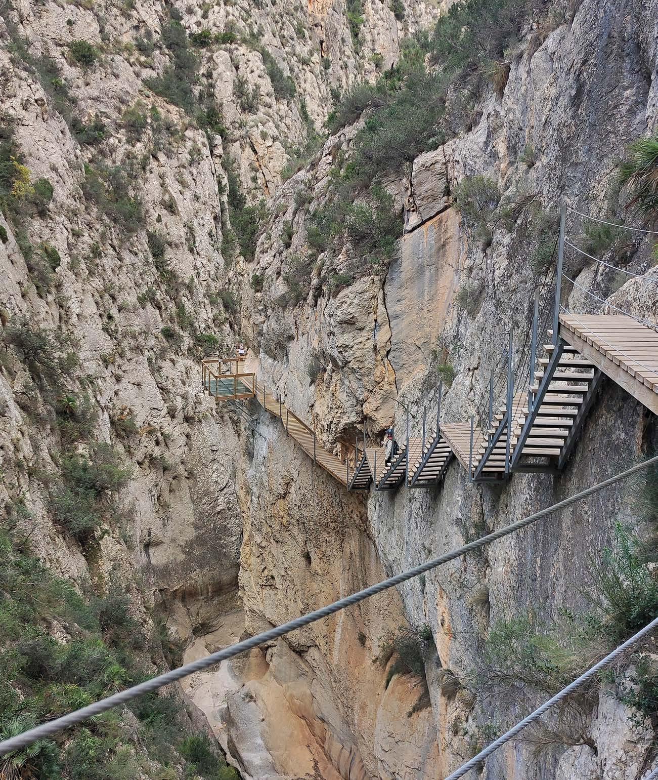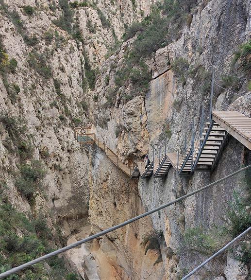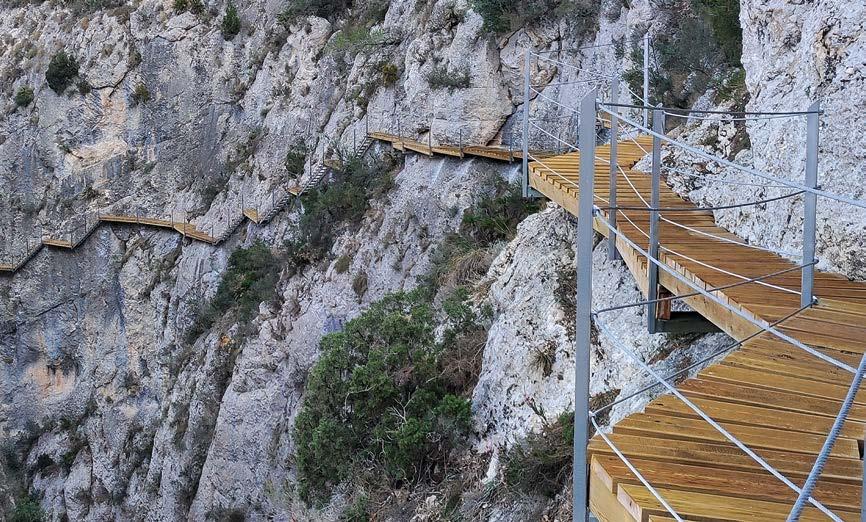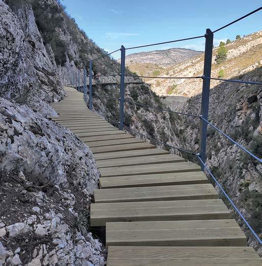 enriquecen gracias a la visita al estrecho y a la experiencia inmersiva del recorrido. Actualmente se encuentra en ejecución una cuarta fase de ampliación destinada a mejorar las condiciones de acceso y trán sito de los visitantes. El objetivo final del Ayuntamiento de Relleu es completar una ruta circular que permita recorrer íntegra mente el cañón sin necesidad de desandar el camino, optimizando así la calidad de la experiencia y la fluidez del itinerario. La pasarela de la presa de Relleu consti tuye un ejemplo paradigmático de cómo la ingeniería contemporánea puede dialogar de forma respetuosa con la ingeniería histó rica y el paisaje natural. La intervención in tegra criterios técnicos rigurosos, soluciones constructivas innovadoras y un profundo compromiso con la protección ambiental, demostrando que es posible hacer accesibles lugares excepcionales sin comprometer su integridad ni su carácter.
