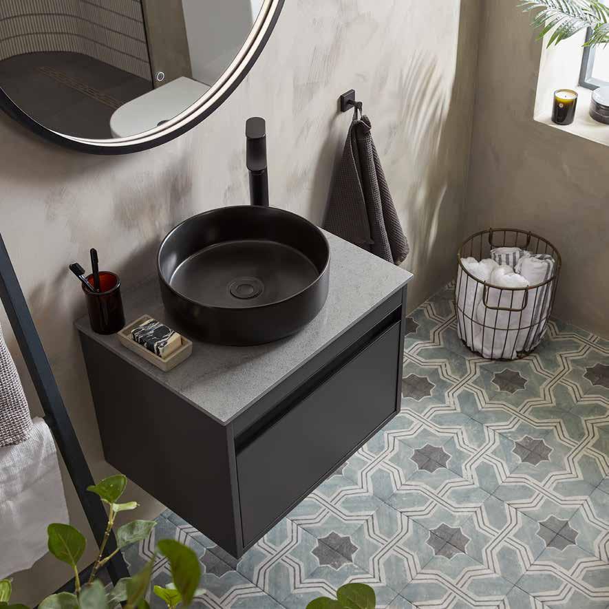 600mm wall mounted unit with arita countertop basin & dark quartz worktop