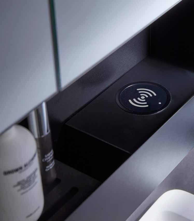 Discover true convenience with our range of charging enabled mirrors and cabinets. Sleekly designed hidden sockets are perfect for tooth brushes or razors. Plus, wireless charging is available in our Boost cabinet (page 54), perfect for charging your phone when you’re busy getting ready.