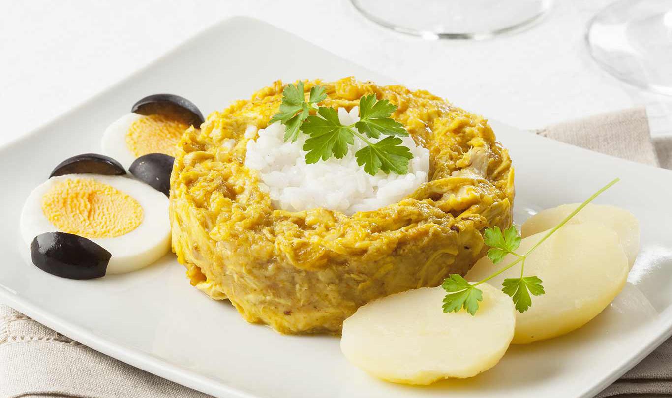 3. Incorporar el pollo: Añade el pollo desmenuzado, sal y pimienta. Mezcla bien y sirve sobre papas cocidas. Decora con huevo y aceitunas.