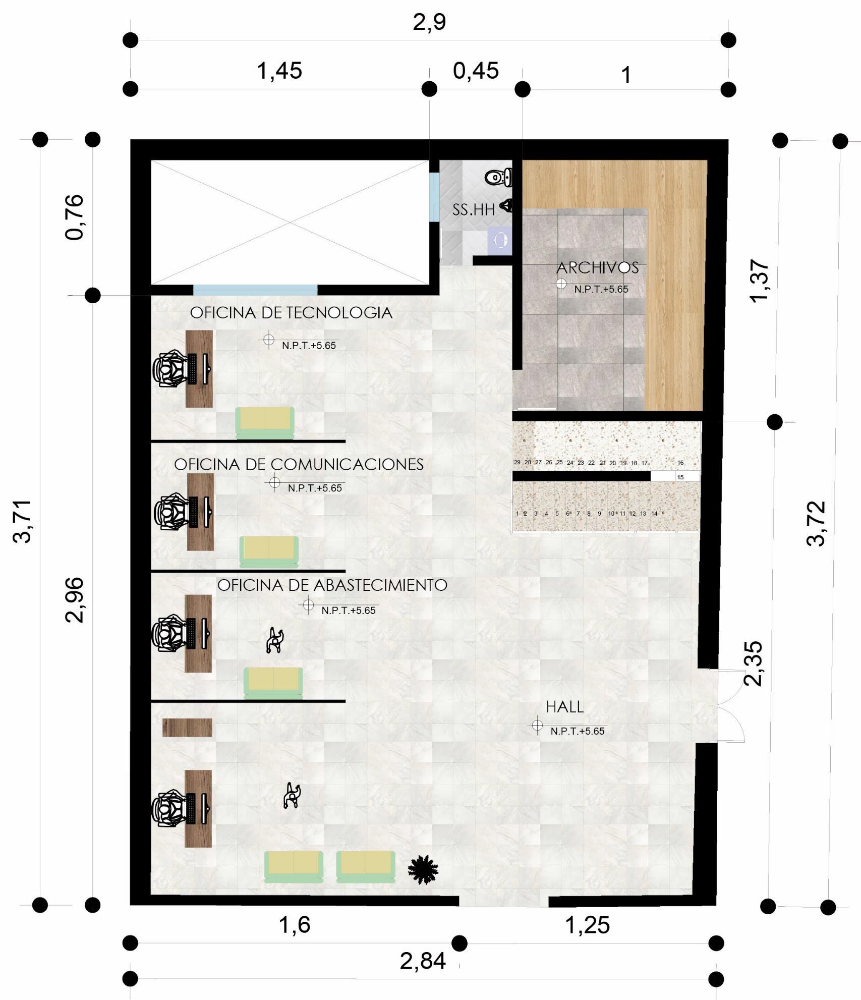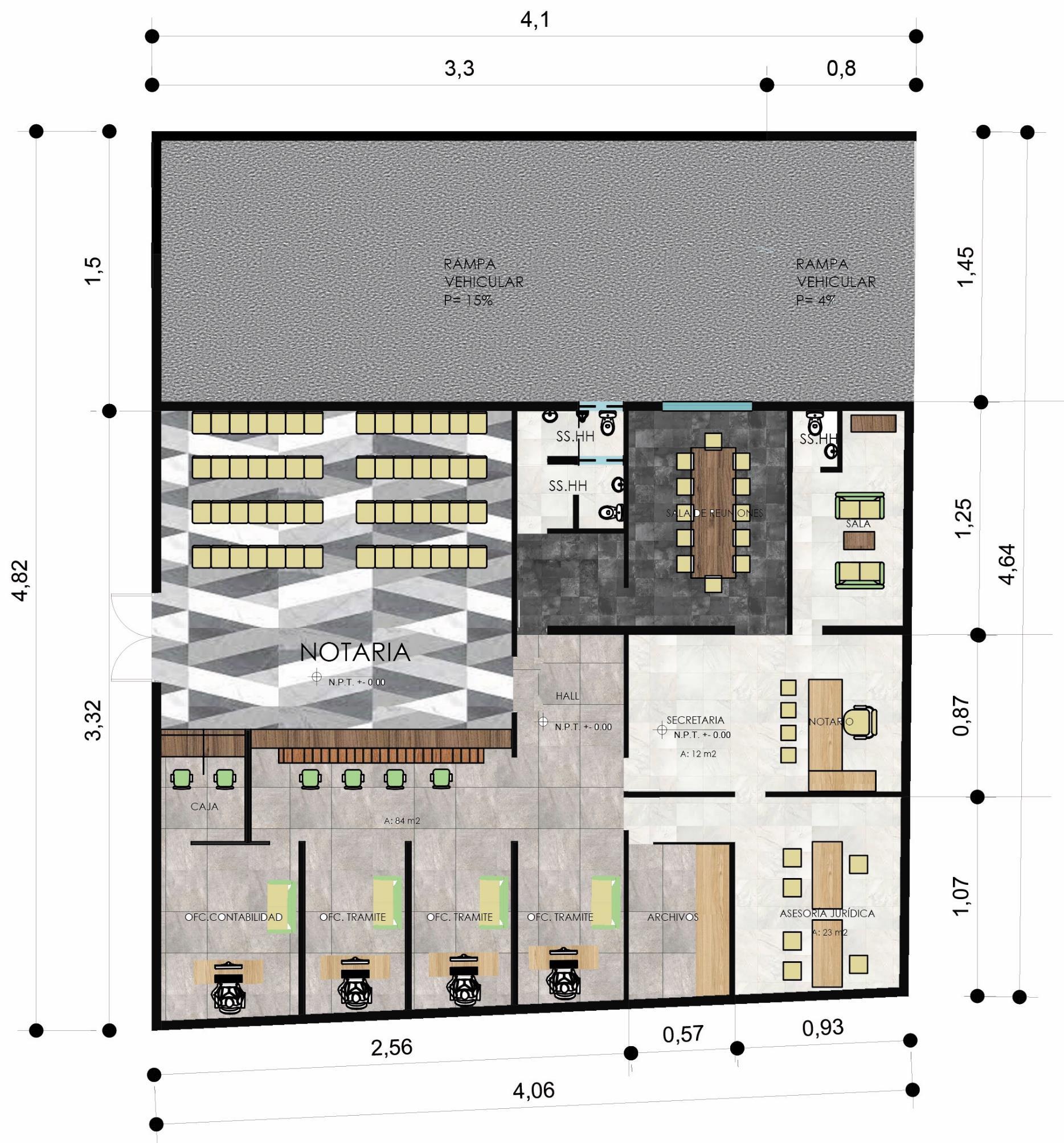 Contamos con la sede de Sunarp establecida en la preexistencia, cuenta con dos niveles, los cuales encontramos las oficinas de tecnología, comunicaciones, abastecimientos.
