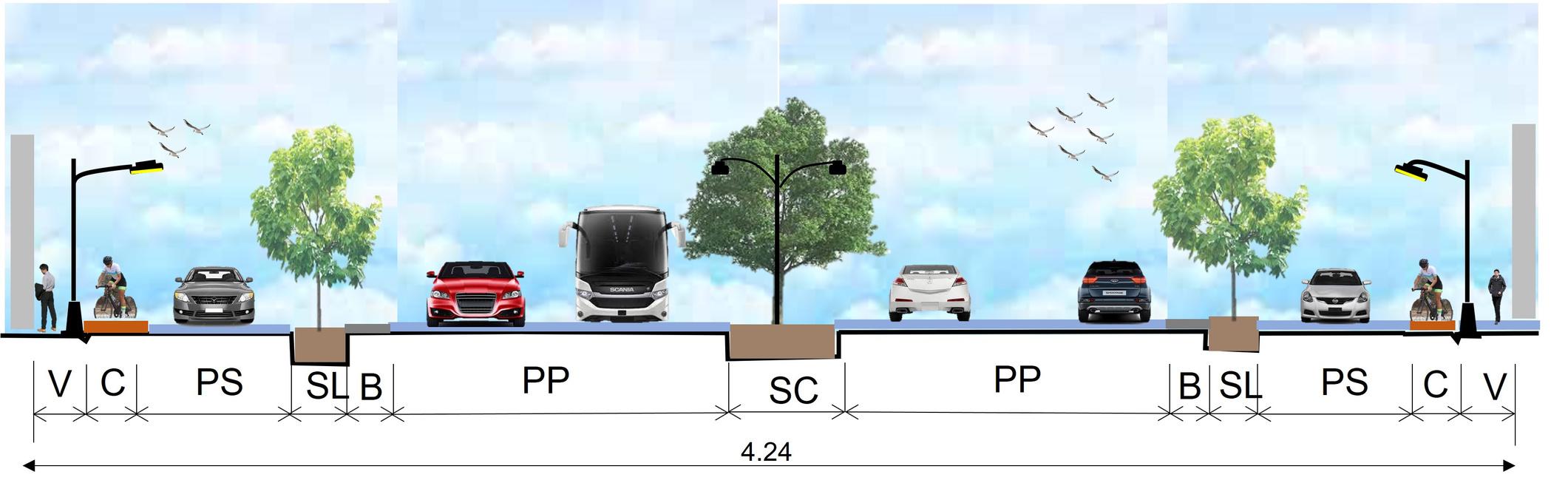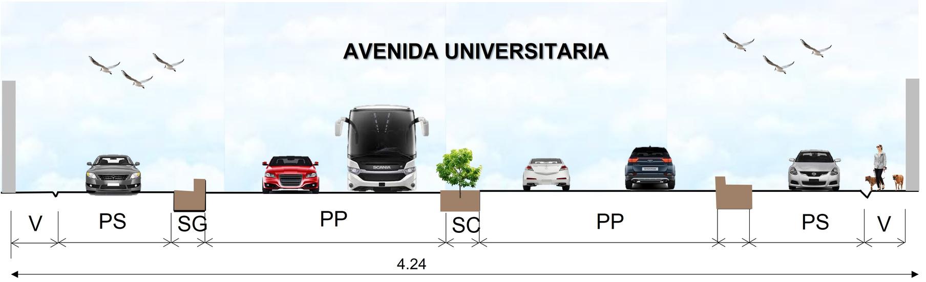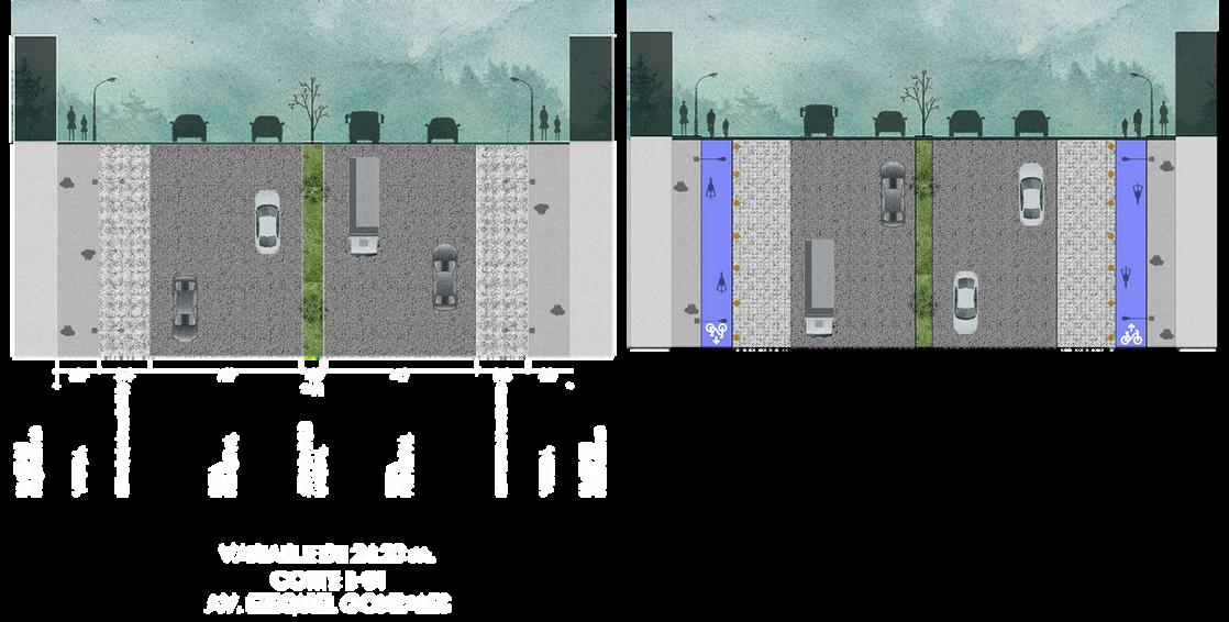 EN CANTA-CALLAO s se propone el aumento de dos ciclovías a cada extremo , separado de la berma por una fila de bolardo , dando así seguridad a los ciclistas, también se hace el mejoramiento de las veredas peatonales.