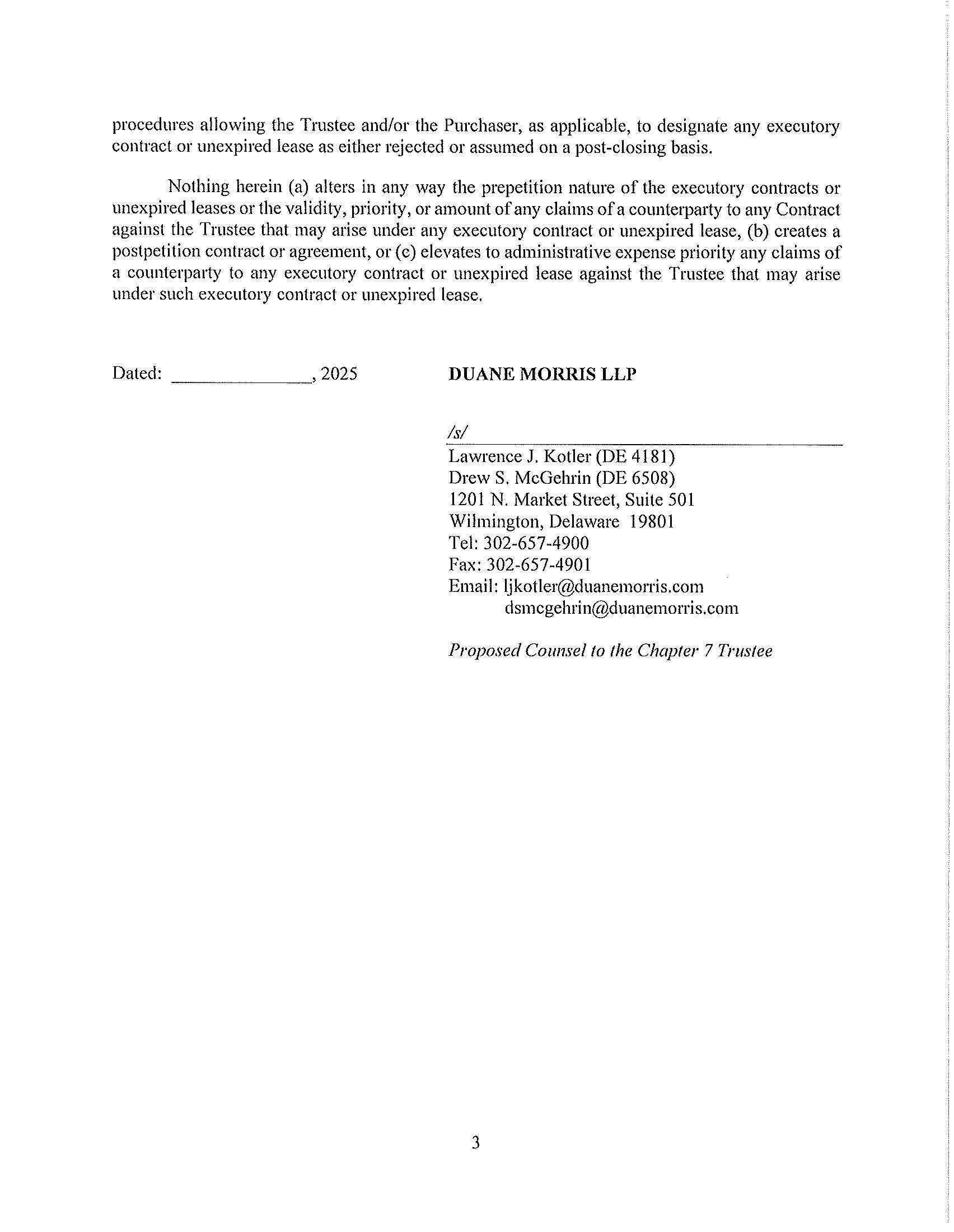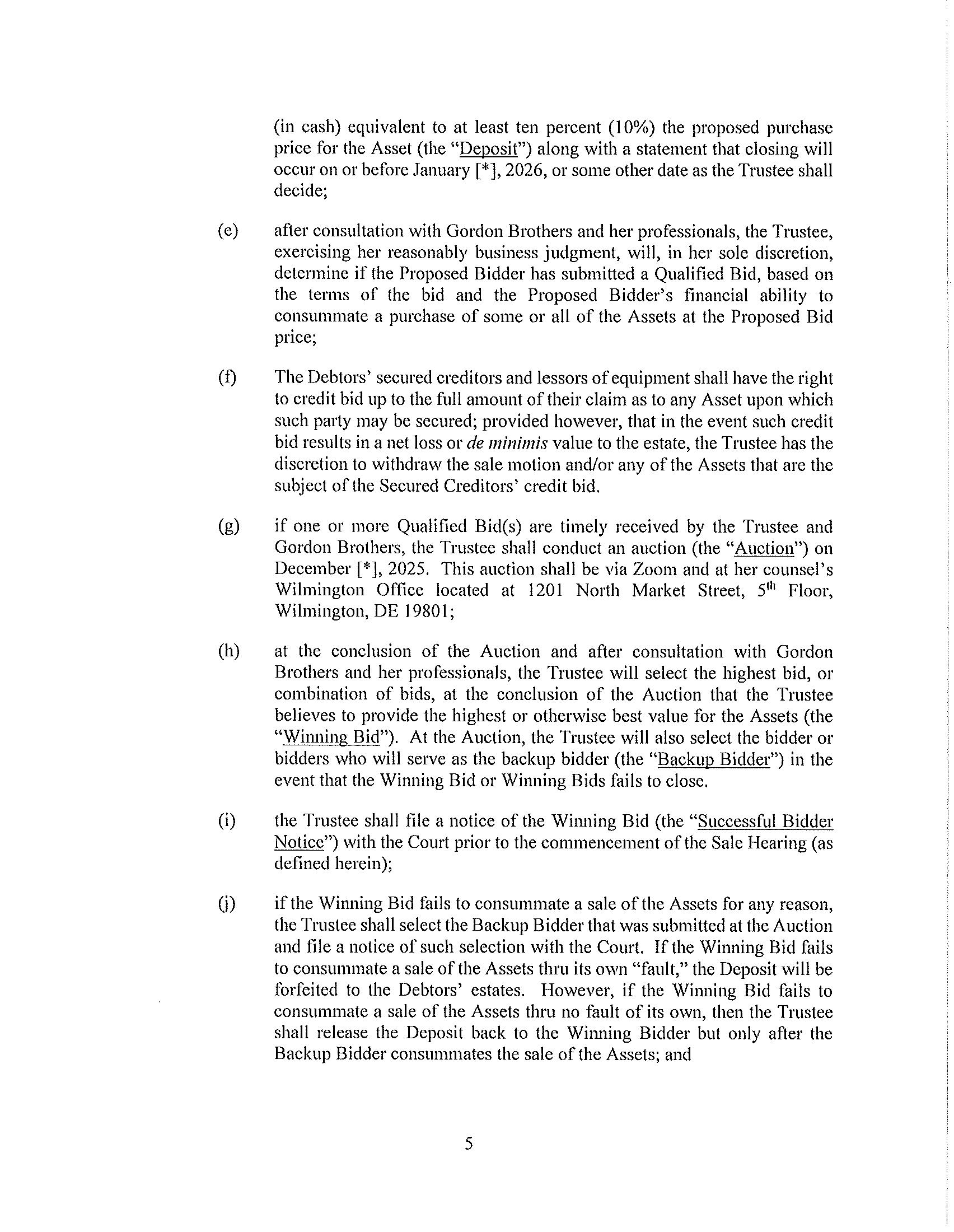 6. Auction. If one or more Qualified Bid(s) are timely received by the Trustee and Gordon Brothers, the Trustee shall conduct an auction (the “Auction”) on December [*], 2025. This auction shall be via Zoom and at her counsel’s Wilmington Office located at 1201 North Market Street, 5th Floor, Wilmington, DE 19801.
