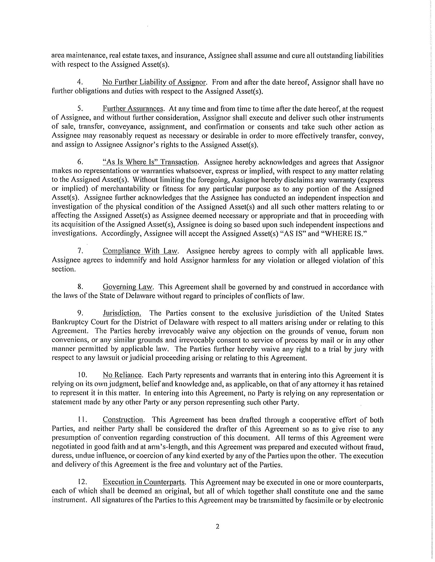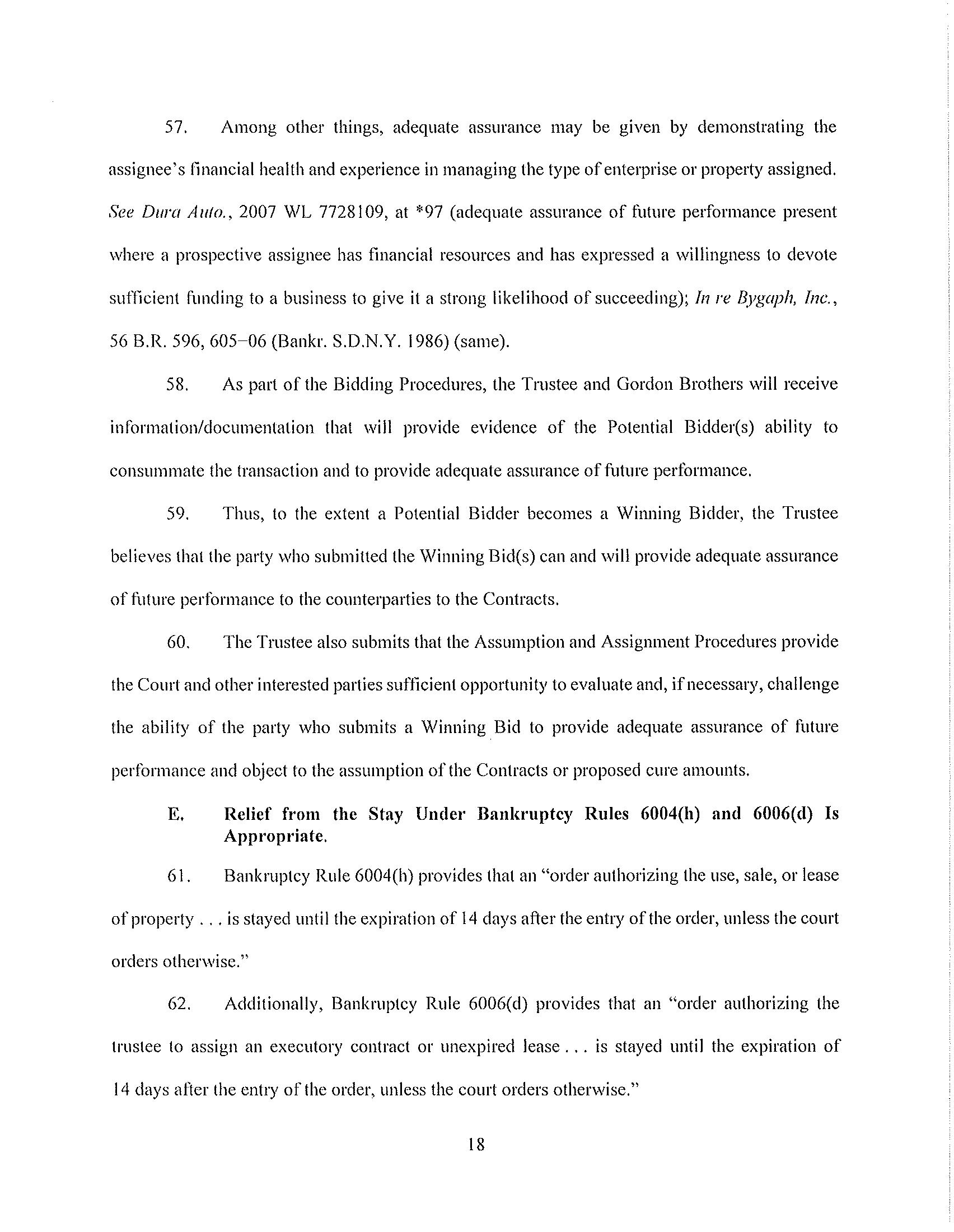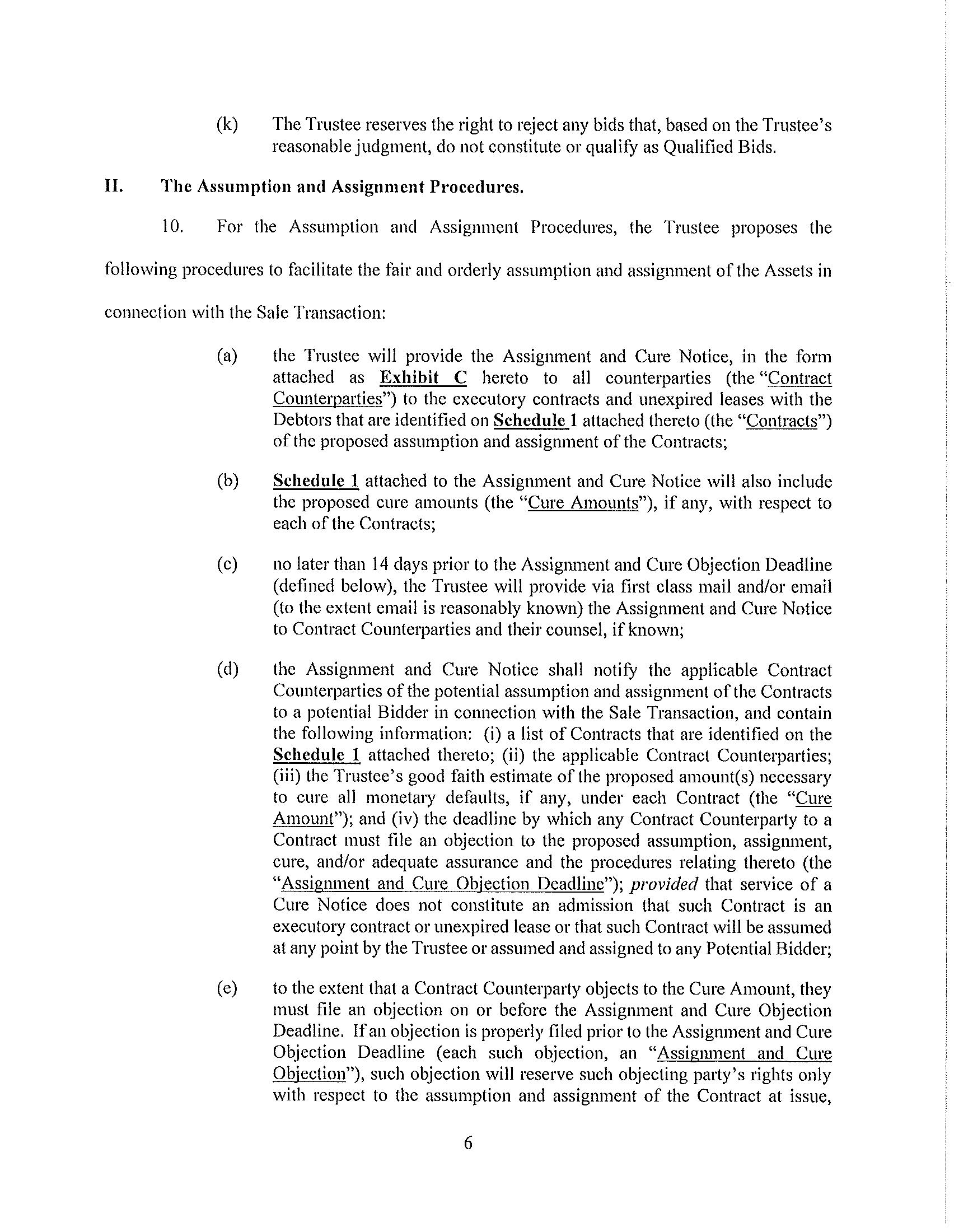 2. Qualified Bids. In order for the bid to qualify (a “Qualified Bid”), the Proposed Bidder must submit the Trustee a written offer in the form of a markup of the form assignment and assumption agreement attached to the Motion as Exhibit D (the “Assignment and Assumption Agreement”) or the form of lease termination agreement attached hereto as Exhibit E (the “Lease Termination Agreement”), and submit information/documentation to the Trustee and Gordon Brothers demonstrating that Proposed Bidder has the financial wherewithal to consummate the proposed transaction. In the event a Proposed Bidder is bidding for less than all of the Assets, the Proposed Bidder should set forth the particular Assets they wish to buy and then itemize on an Asset by Asset basis the value that they ascribing to each individual Asset, again, exclusive of Cure Amounts. The Trustee reserves all of her rights to reject or accept any bid and to extend all dates referenced herein.