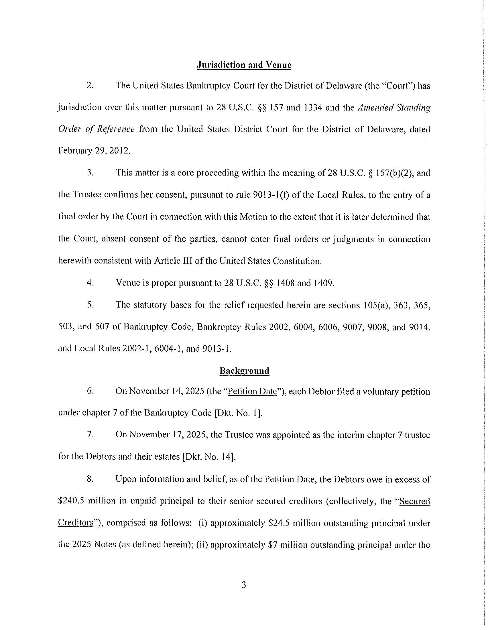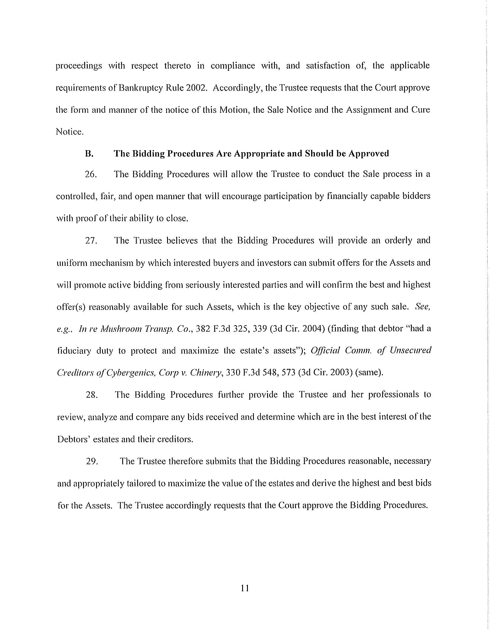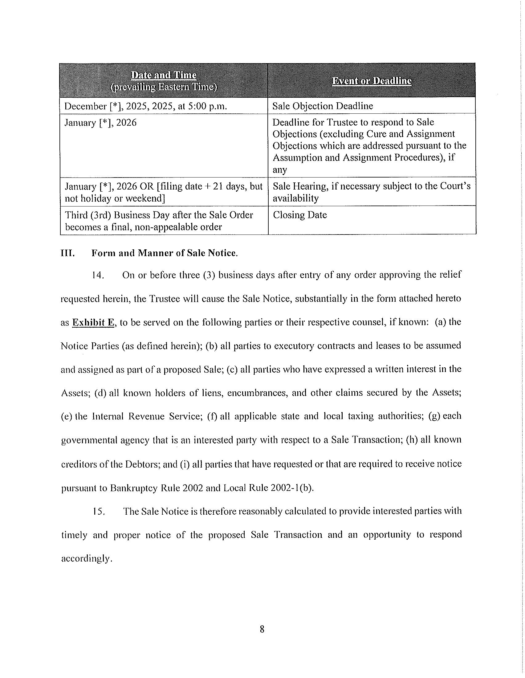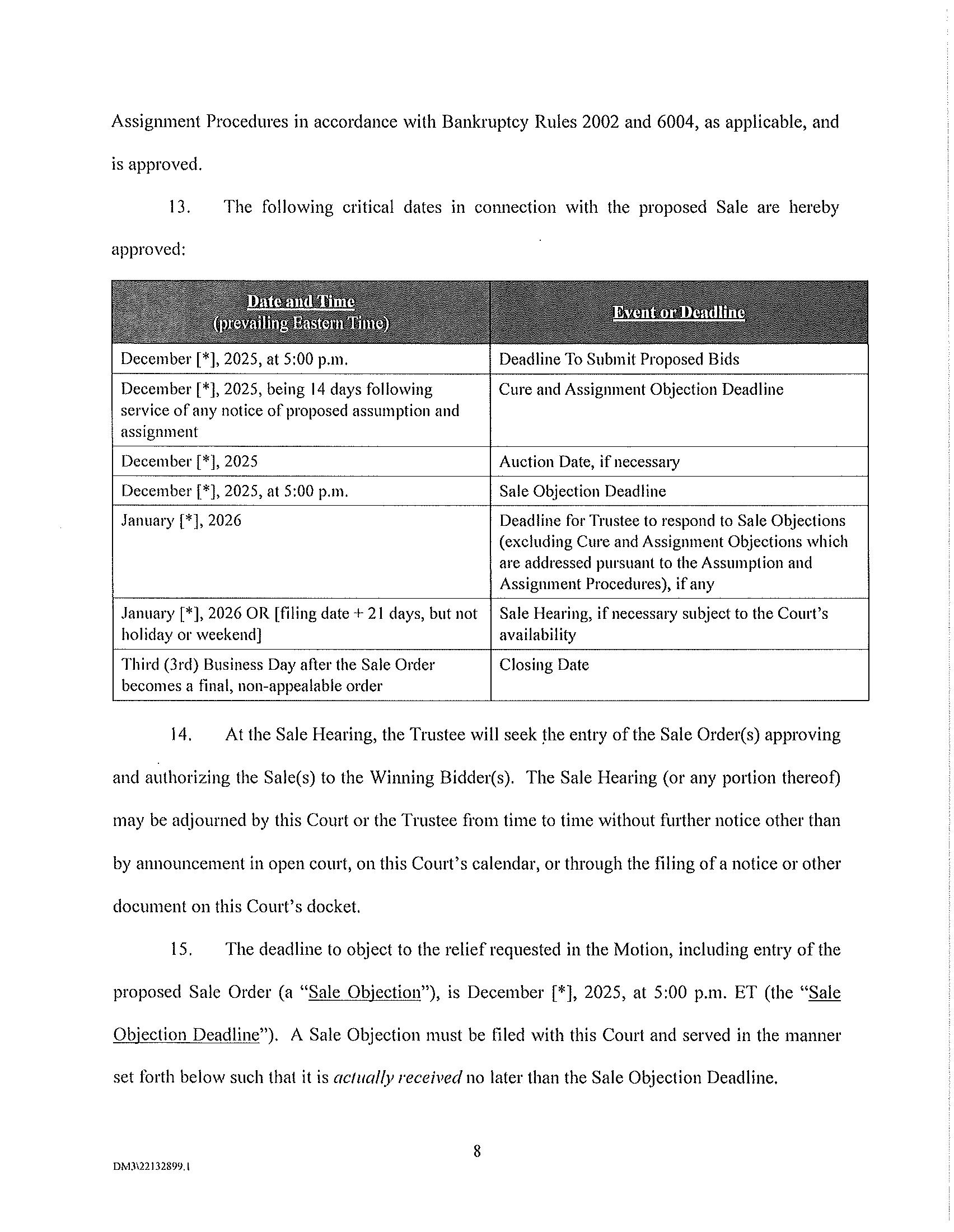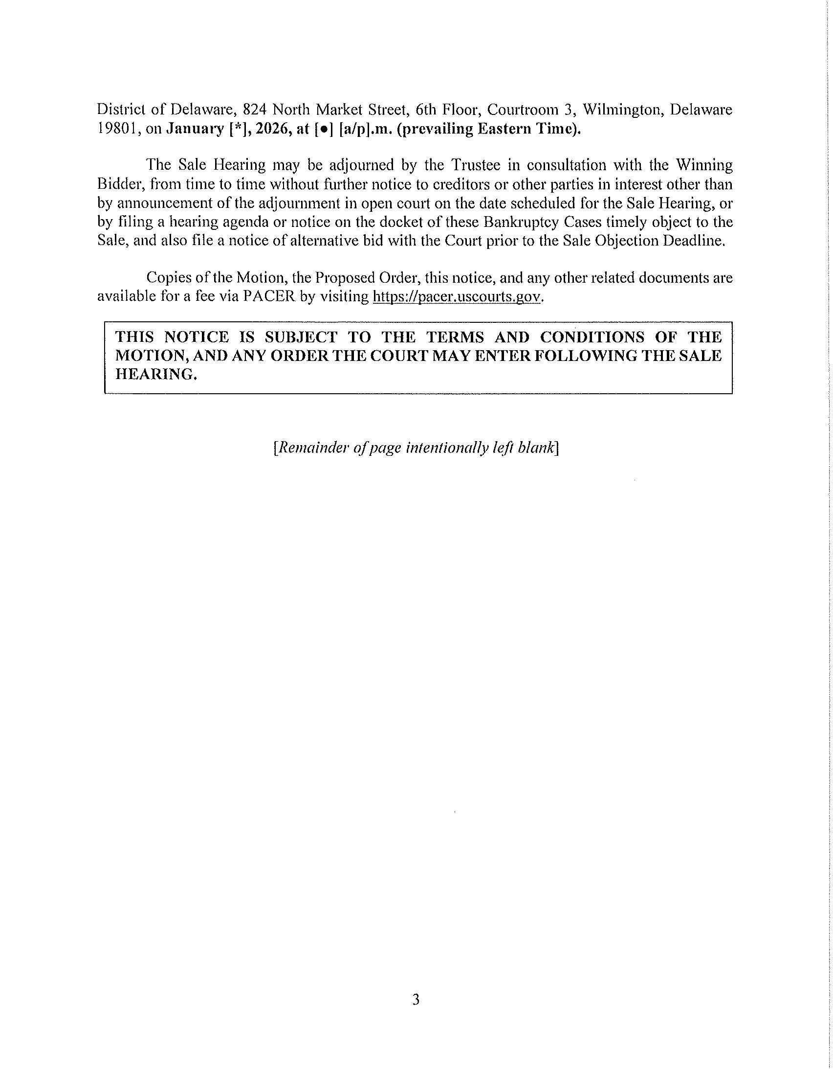 The Winning Bid and any Backup Bidder will be subject to approval by the Court. The Sale Hearing to approve the Winning Bid and any Backup Bidder shall take place on January [*], 2026 at [__:__]. The Sale Hearing may be adjourned by the Trustee in consultation with the Winning Bidder, from time to time without further notice to creditors or other parties in interest other than by announcement of the adjournment in open court on the date scheduled for the Sale Hearing, or by filing a hearing agenda or notice on the docket of these Bankruptcy Cases.