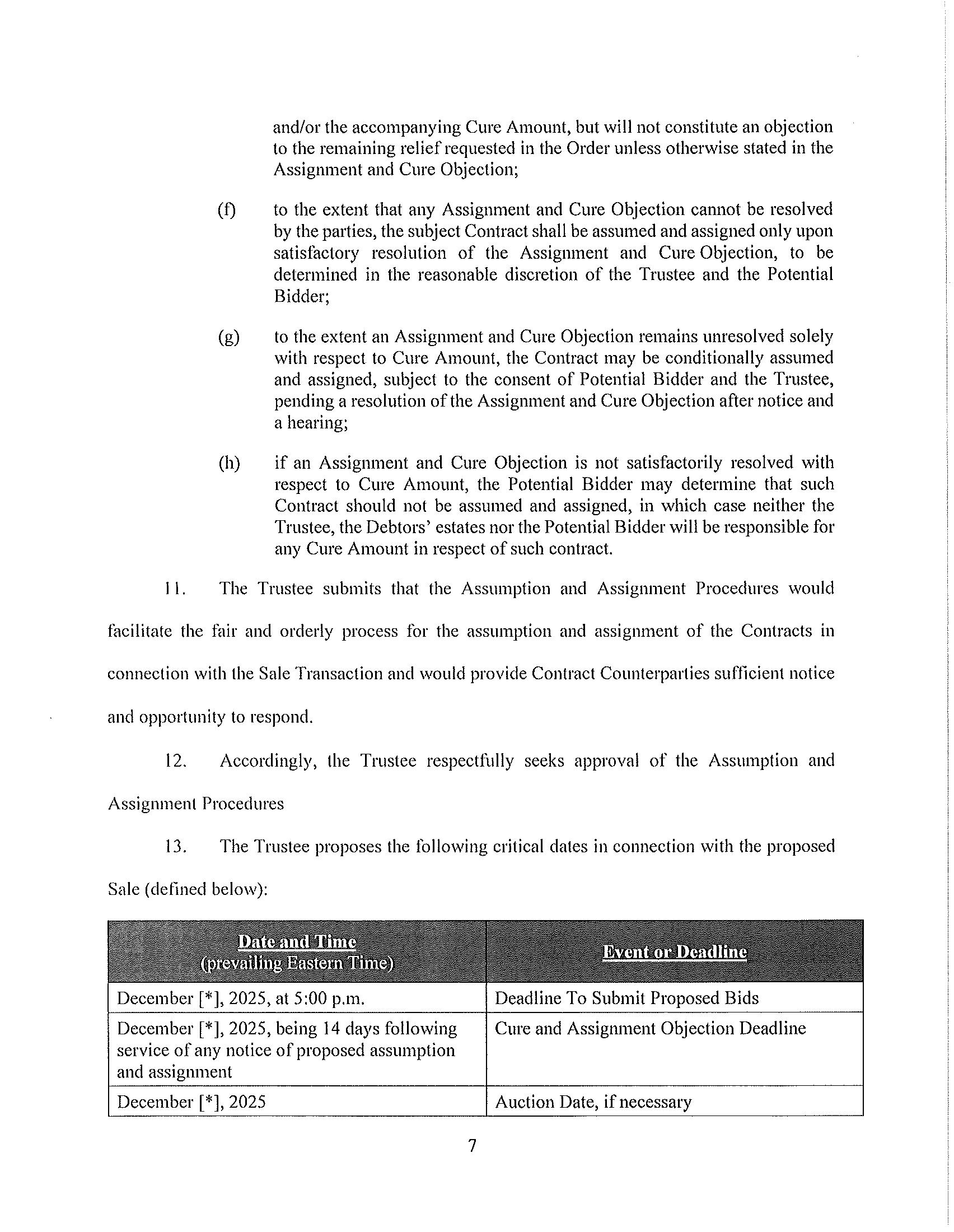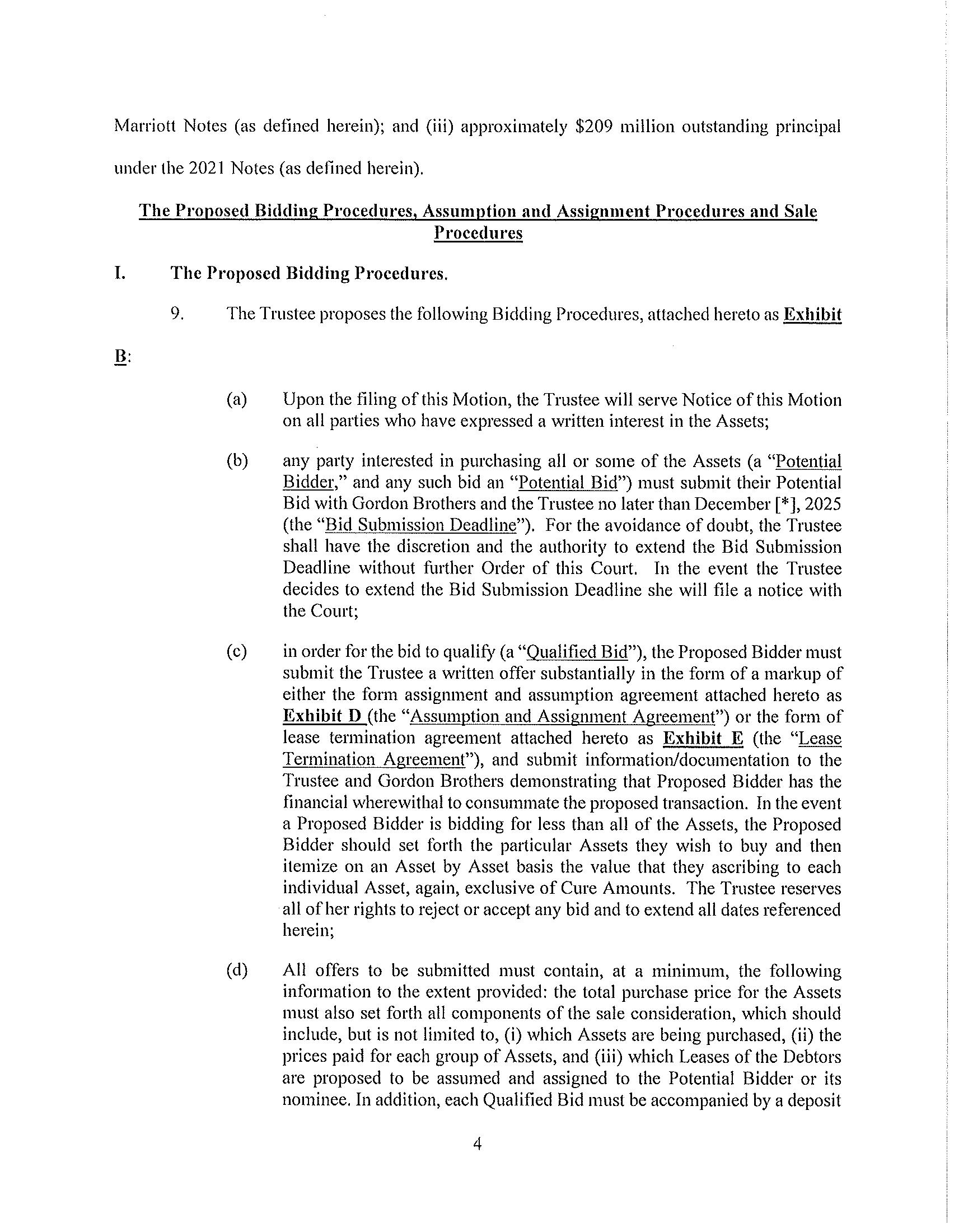 1. Potential Bids Any party interested in purchasing all or some of the Assets (a “Potential Bidder,” and any such bid an “Potential Bid”) must submit their Potential Bid with Gordon Brothers and the Trustee no later than December [*], 2025 (the “Bid Submission Deadline”). For the avoidance of doubt, the Trustee shall have the discretion and the authority to extend the Bid Submission Deadline without further Order of this Court. In the event the Trustee decides to extend the Bid Submission Deadline she will file a notice with the Court;.