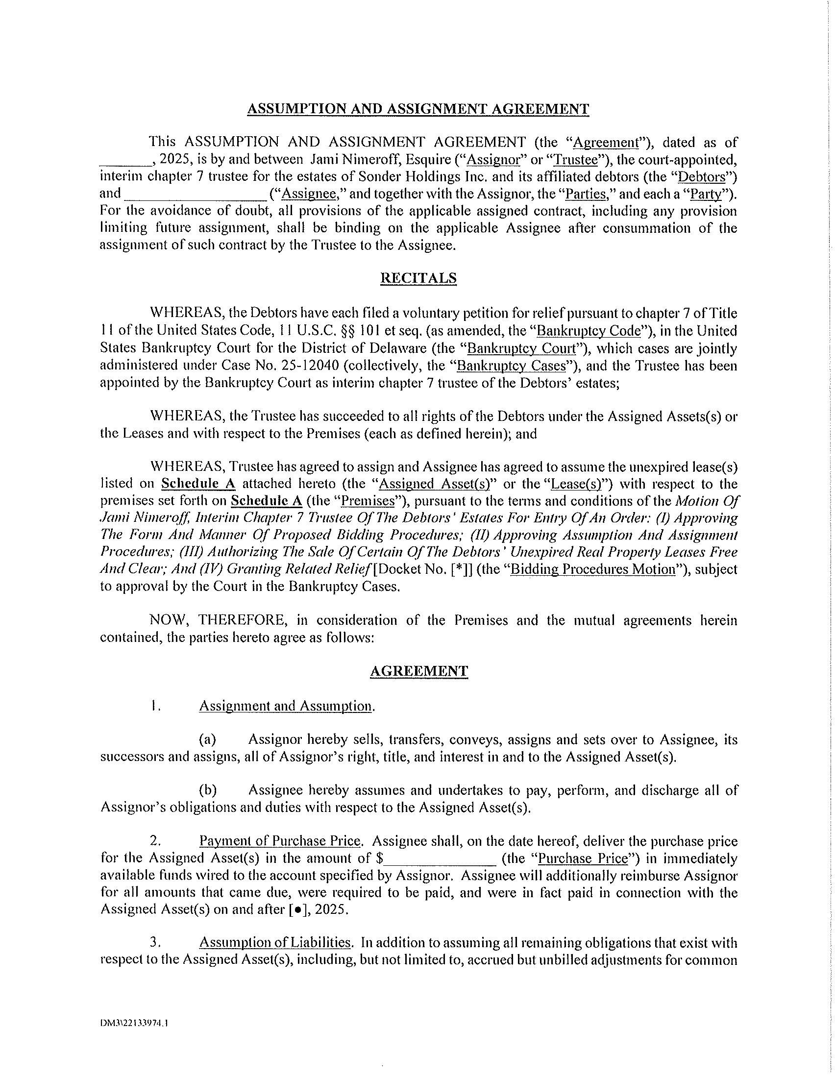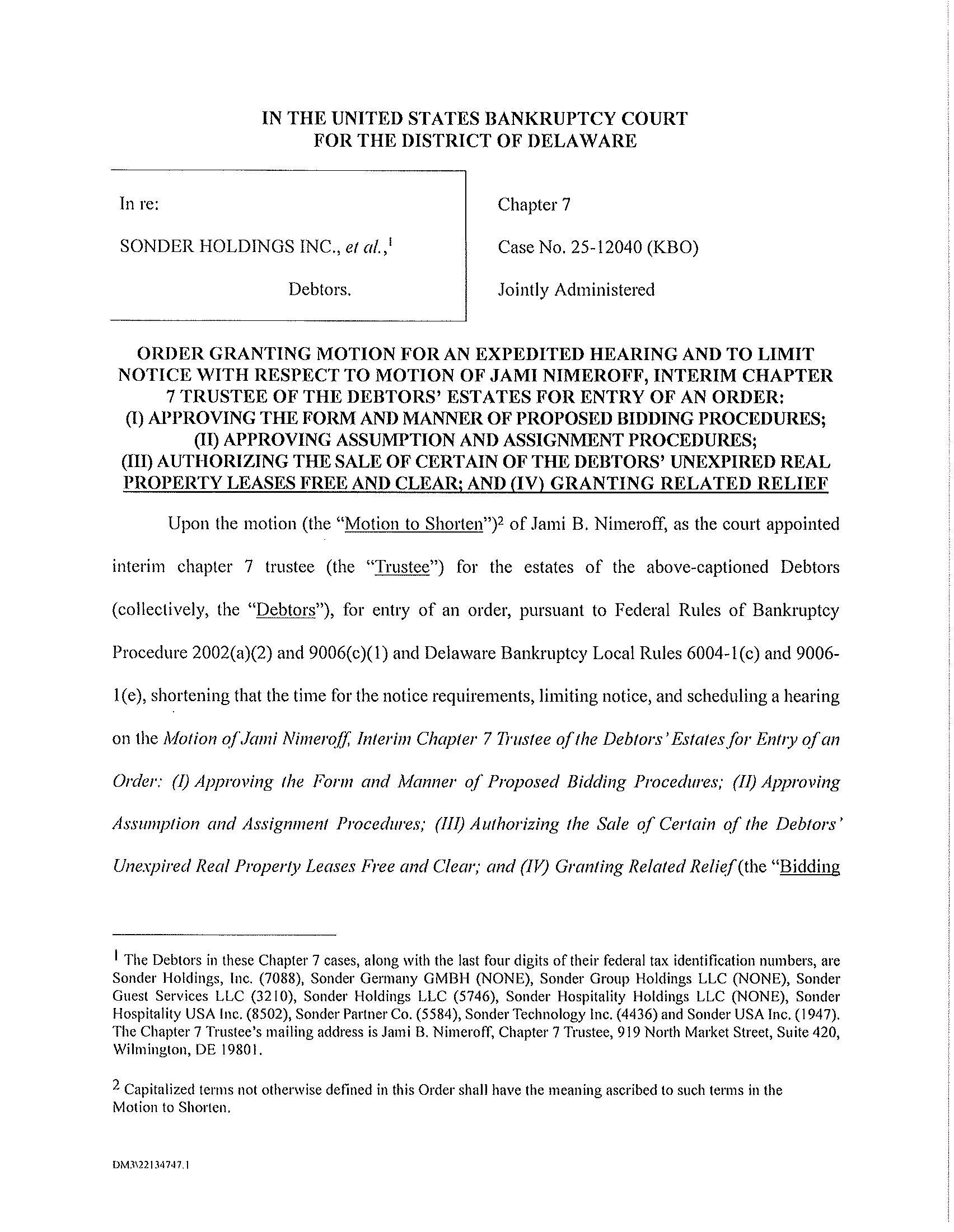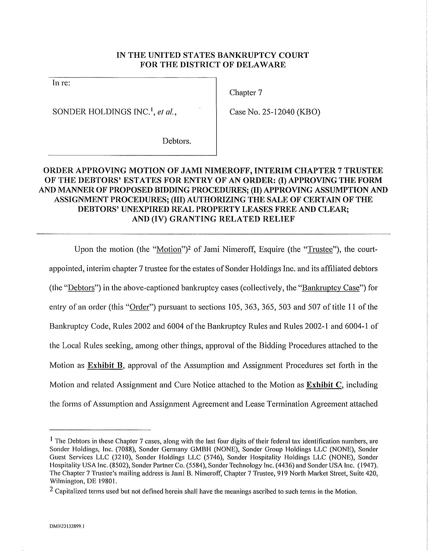 PLEASE TAKE NOTICE that on December 3, 2025, Jami Nimeroff, Esquire (the “Trustee”), the court-appointed, interim chapter 7 trustee for the estates of Sonder Holdings Inc. and its affiliated debtors (the “Debtors”) in the above-captioned bankruptcy cases, by and through her undersigned counsel, filed the Motion of Jami Nimeroff, Interim Chapter 7 Trustee of the Debtors’ Estates for Entry of an Order: (I) Approving the Form and Manner of Proposed Bidding Procedures; (II) Approving Assumption and Assignment Procedures; (III) Authorizing the Sale of Certain of the Debtors’ Unexpired Real Property Leases Free and Clear; and (IV) Granting Related Relief [Docket No. 123] (the “Bidding Procedures Motion”) with the United States Bankruptcy Court for the District of Delaware (the “Bankruptcy Court”).