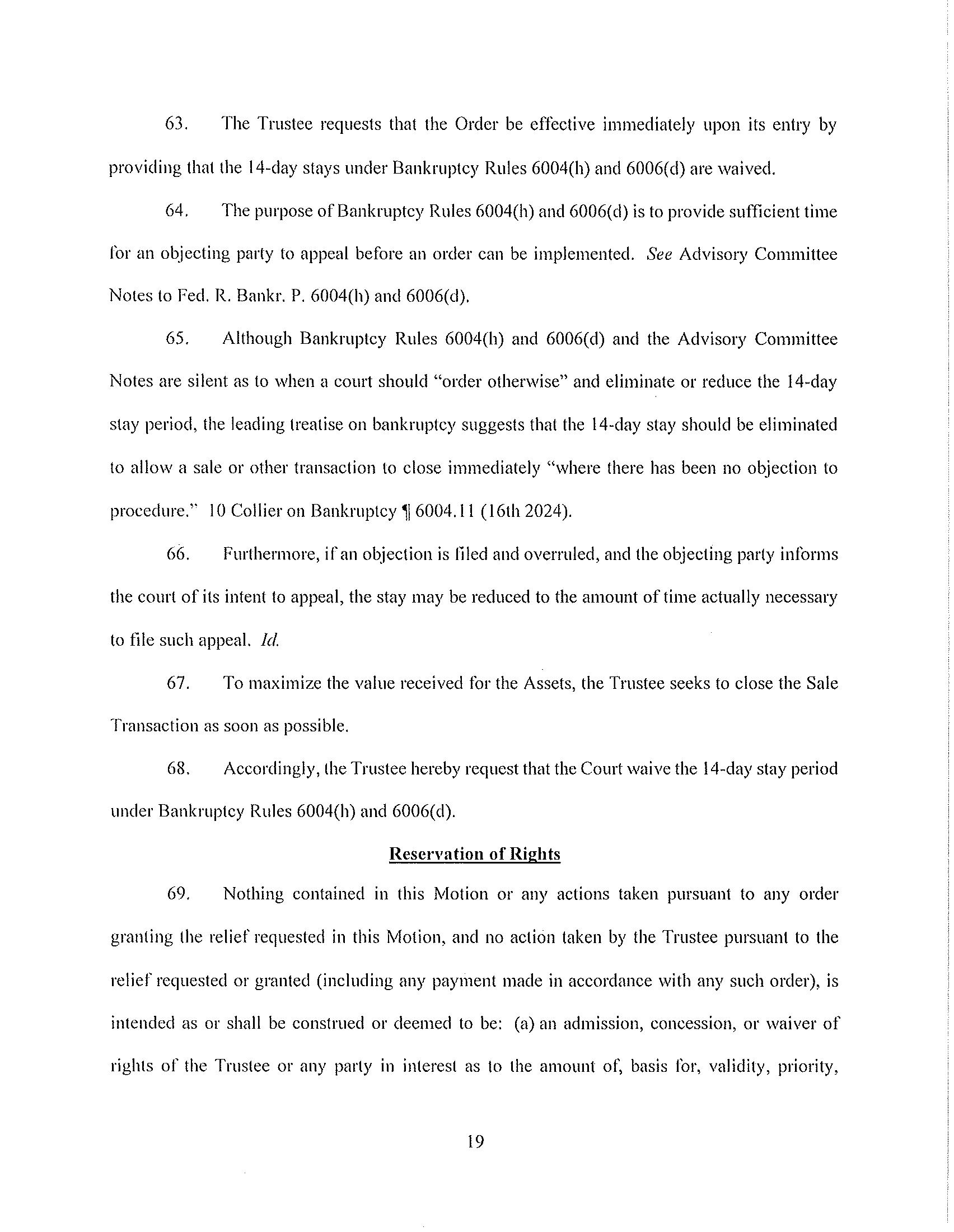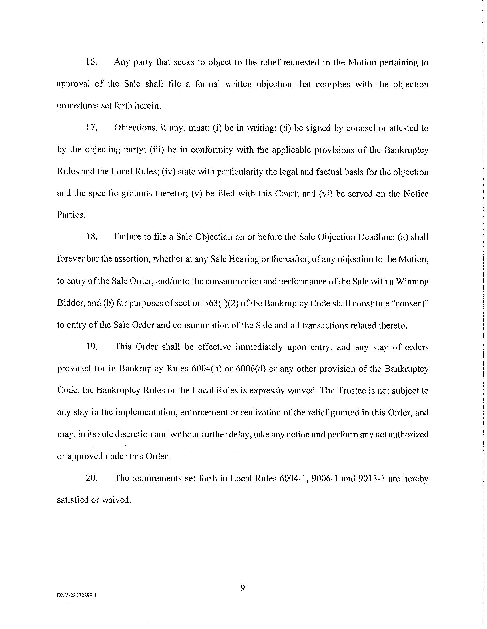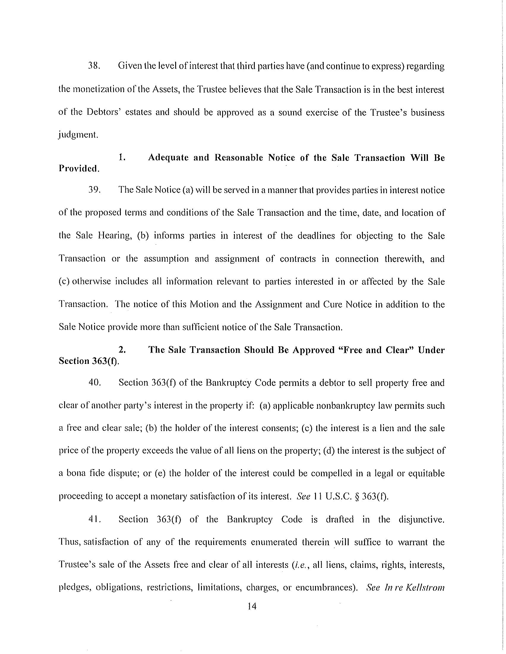 At the Sale Hearing, the Trustee will seek the entry of Sale Order(s) that, among other things: (i) authorizes and approves the Sale(s) to the Winning Bidder(s) free and clear of all liens, claims, and encumbrances; and (ii) includes a finding that the Winning Bidder(s) is a good-faith purchaser pursuant to section 363(m) of the Bankruptcy Code.