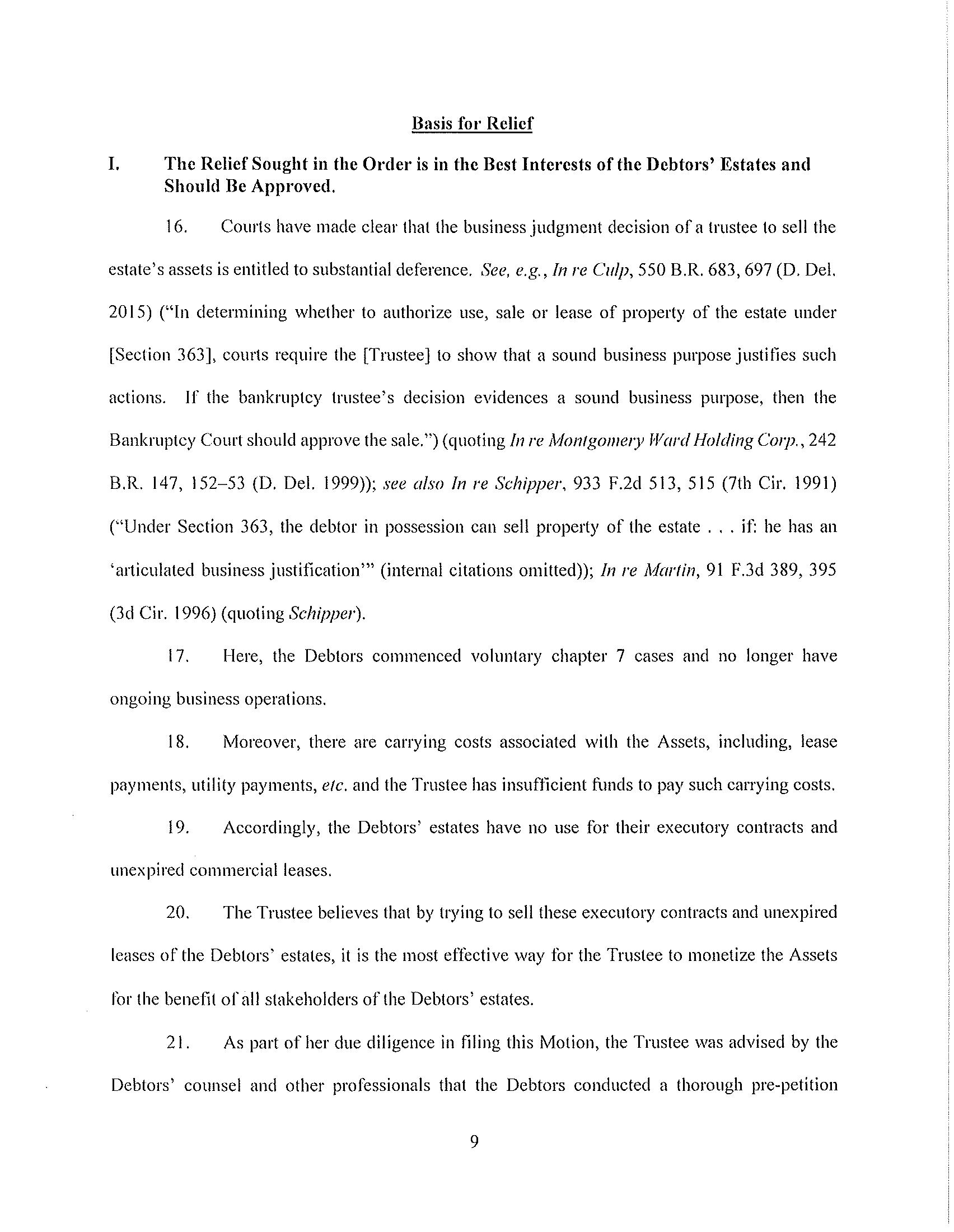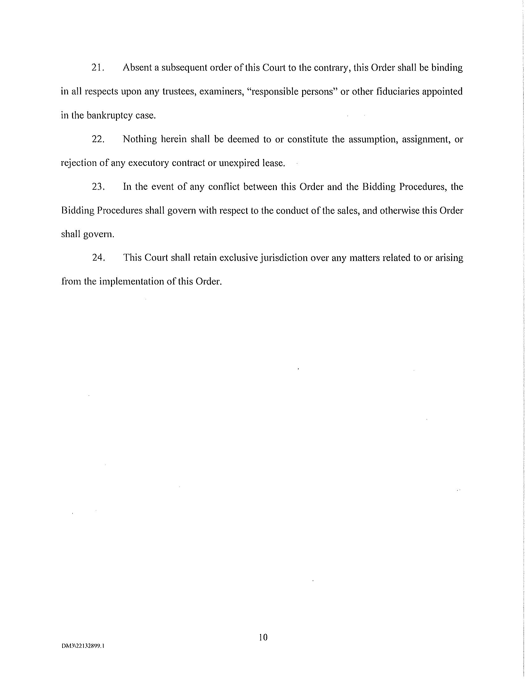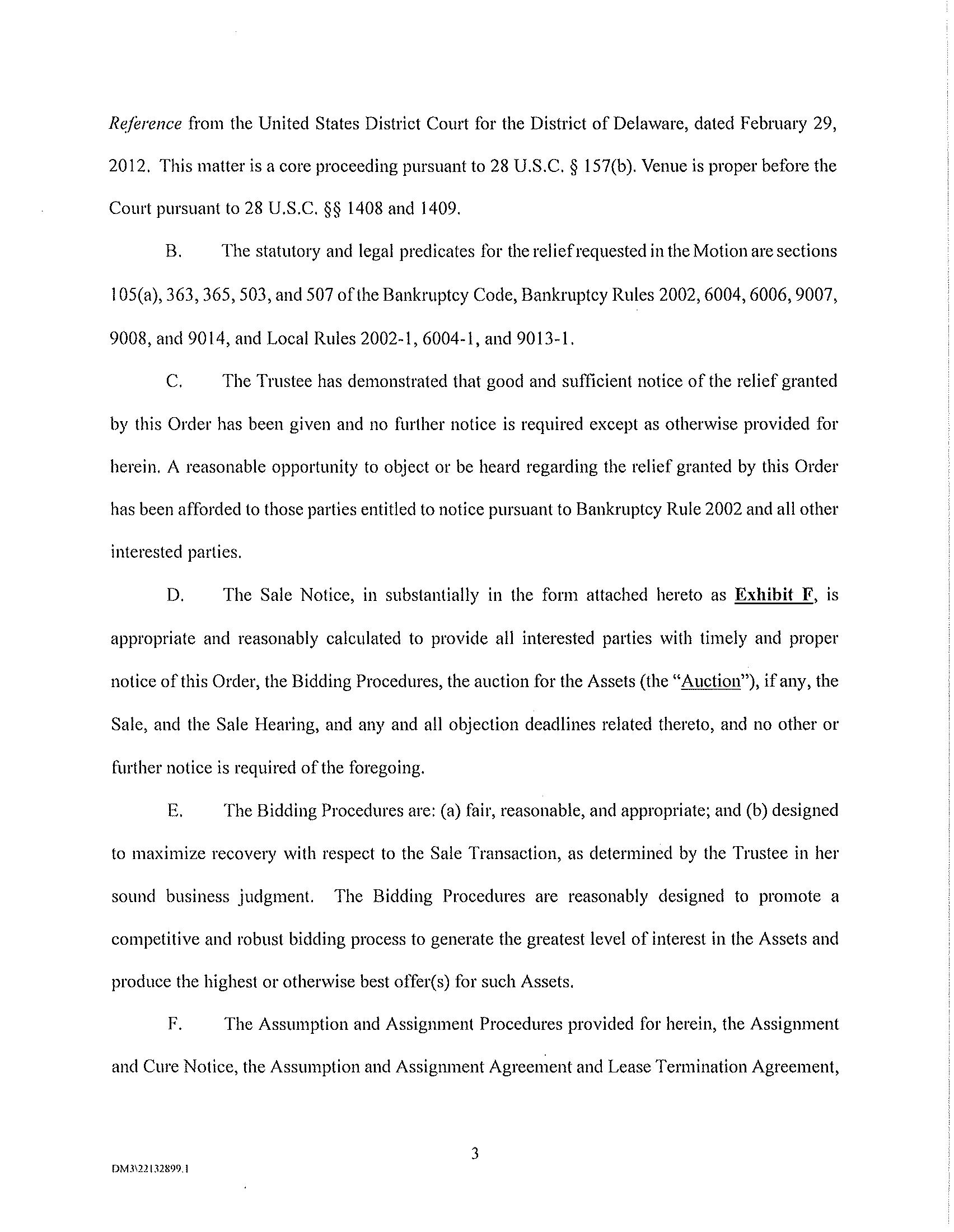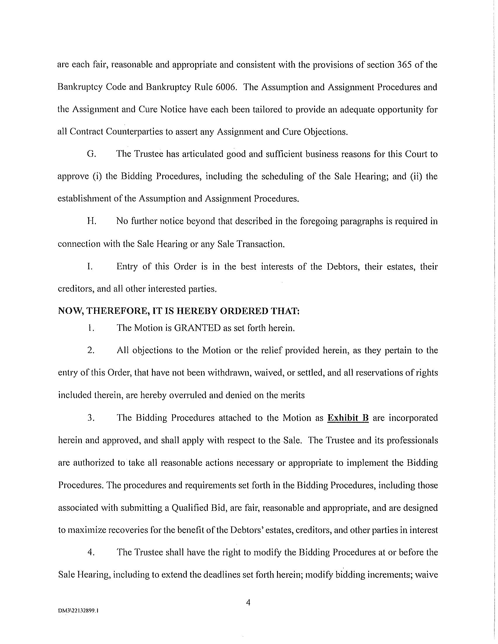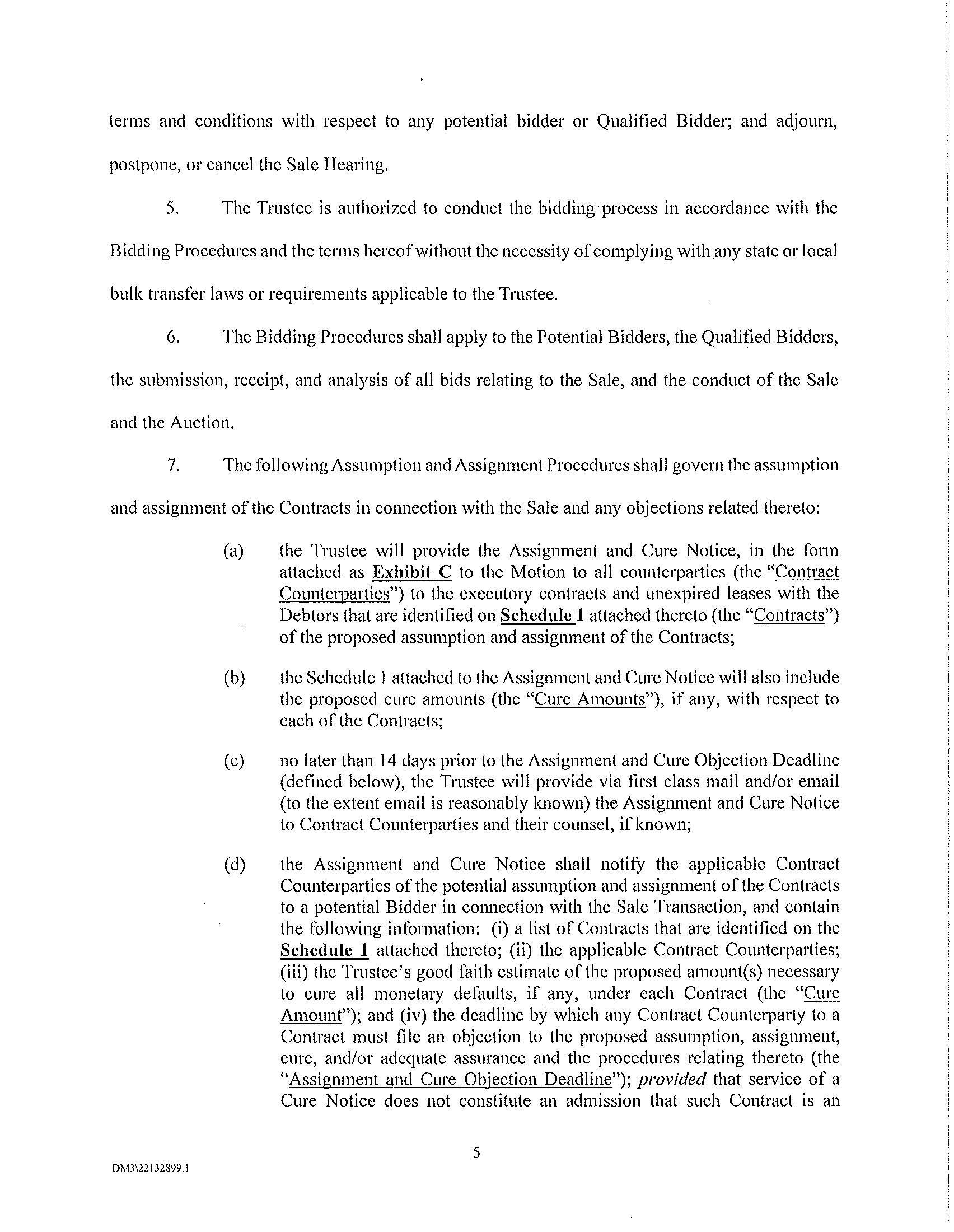 On [*] the Court entered an order [Dkt. No. *] (the “Bidding Procedures Order”) granting, among other things, certain relief requested in the related motion [Dkt. No. *] (the “Bidding Procedures Motion”), including authorizing the Debtors to solicit bids and approving the procedures set forth herein (collectively, the “Bidding Procedures”) in connection with the proposed sale (the “Sale”) of certain of the Debtors’ leases described more fully in the Bidding Procedures Motion (collectively, with all associated owned personal property, located at, or used primarily in connection with, such properties and all owned digital assets (e.g. photos) associated with such properties, to the extent transferable, any licenses or permits necessary for the operation of the properties, and any and all codes, keys and similar access mechanisms required to access and maintain the properties, the “Assets”) free and clear of all liens, claims, encumbrances, and interests.