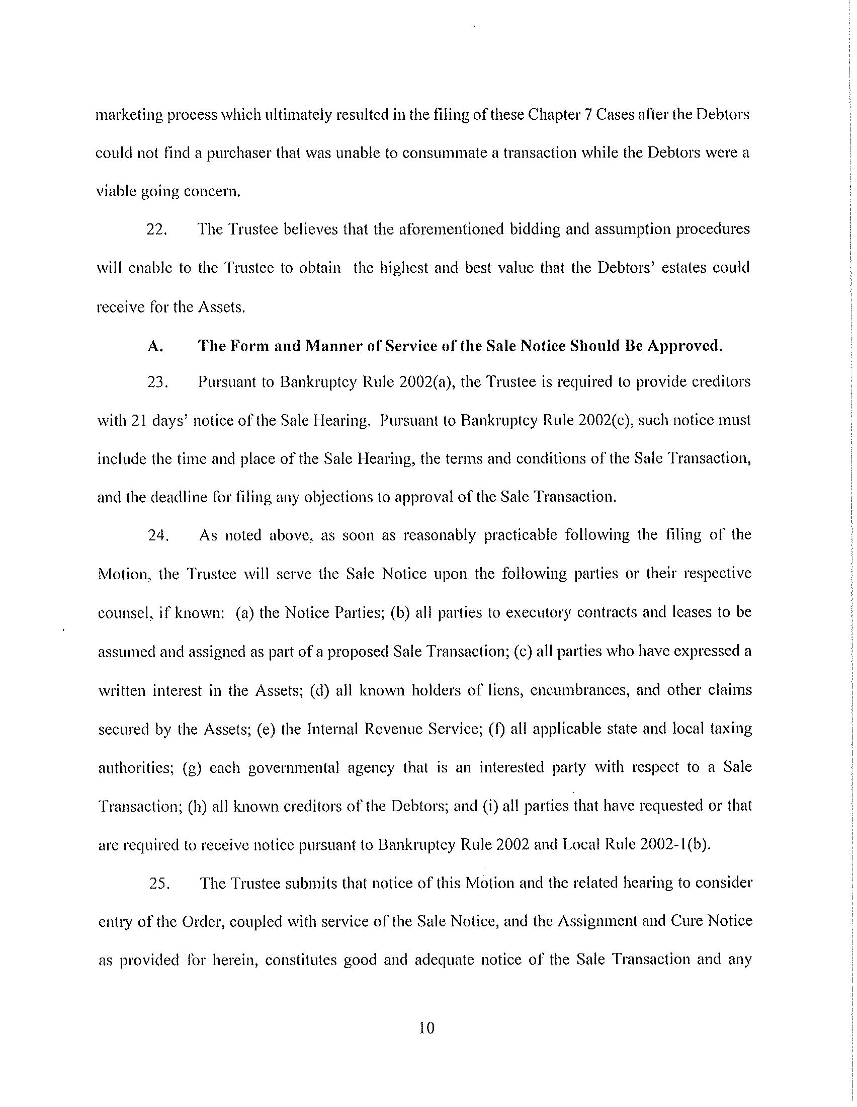 PLEASE TAKE FURTHER NOTICE that pursuant to the Bankruptcy Court’s Order Granting Motion for an Expedited Hearing and to Limit Notice with respect to Motion of Jami Nimeroff, Interim Chapter 7 Trustee of the Debtors’ Estates for Entry of an Order: (I) Approving the Form and Manner of Proposed Bidding Procedures; (II) Approving Assumption and Assignment Procedures; (III) Authorizing the Sale of Certain of the Debtors’ Unexpired Real Property Leases Free and Clear; and (IV) Granting Related Relief [Docket No. 127] (the “Scheduling Order”), a hearing on the Bidding Procedures Motion will be held before the Honorable Karen B. Owens, United States Bankruptcy Judge, at the Bankruptcy Court, 824 North