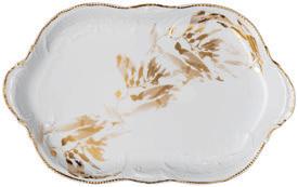 Die verspielt-barocke RosenthalForm Sanssouci bildet die Bühne für das Dekor Midas, das monochromatisch in Gold gehalten ist. Muster mit aparten Zweigen und Blättern werden in Schichten übereinander gelegt, changieren zwischen matten und glänzenden Oberflächen und lassen im Aufeinandertreffen mit dem Porzellanrelief ein ausgesprochen sinnliches Zusammenspiel entstehen. Das dreidimensional anmutende Camouflage-Dekor ist nach dem mythologischen König Midas benannt, dem Dionysos einen Wunsch erfüllt hatte: Alles, was er berührte, verwandelte sich in Gold.