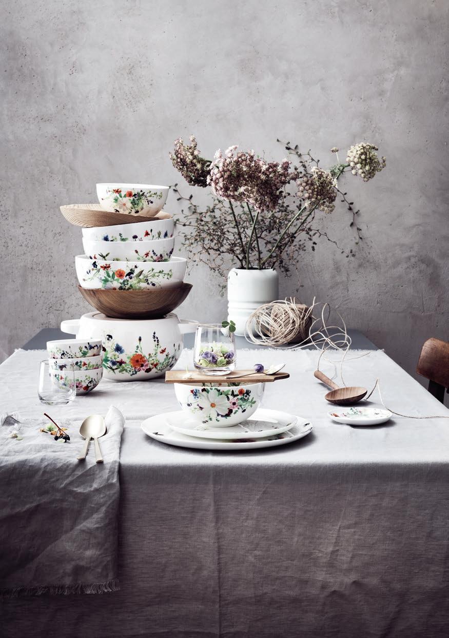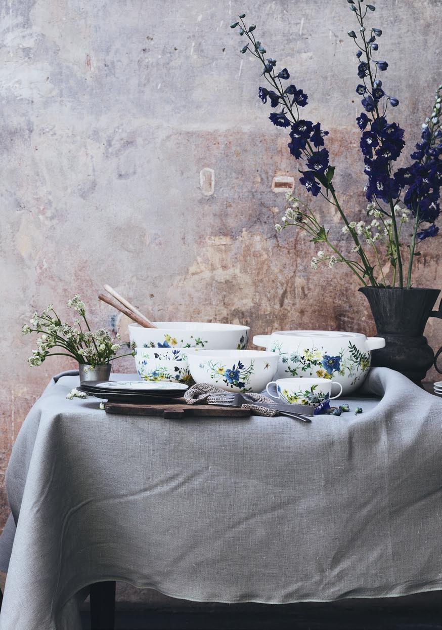 Leuchtende Blumen, das Summen von Insekten, zarte Blätter und kühles Gras – zu einem Spaziergang in der Phantasie lädt der Dekor »Fleurs Sauvages« ein. Inspiriert von der wunderbaren Harmonie und vielfältigen Flora einer Blumenwiese, entwarf die Schweizer Textildesignerin Regula Stüdli ein Arrangement aus Wildblumen und filigranen Ästchen, wie zufällig hingestreut und in reizvollem Kontrast zu grünen Blättern und weißen Blüten.