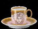 The Medusa Amplified short sets pay tribute to Versace‘s institutional Medusa, reimagined and amplified in fresh pastel colours. The iconic head is imposingly emblazoned in green, blue, pink and orange on Rosenthal plates framed by classic meander band in gold.