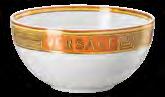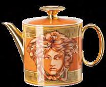 La Medusa, storico simbolo di Versace, è preziosamente riprodotta sui piatti nelle tonalità del verde, del blu, del rosa e dell’arancio incorniciati dal classico motivo Greca dorato.