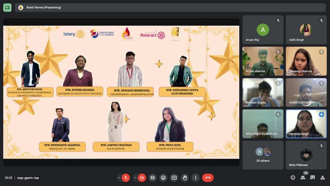 The Rotaract Club of GL Bajaj organized its tenure's DRR's Official Visit on March 11, 2024, via an online meeting platform. The meeting commenced promptly at 9:00 PM with a formal welcome by the Masters of Ceremony (MOC), Rtr. Aryan Raj & Rtr. Aditi Singh, who extended a warm welcome to the esteemed guests.