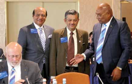 Right: Change-over ceremony: RID C Basker accompanies the incoming directors Kamal Sanghvi and Bharat Pandya to the RI Board.