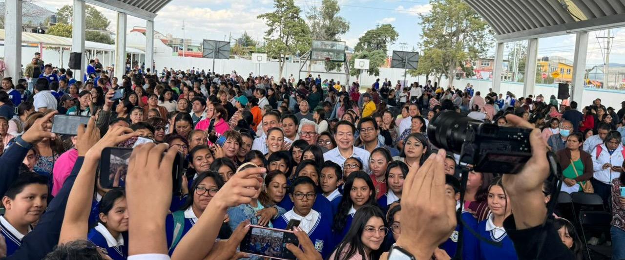 La Presidenta de México, Claudia Sheinbaum Pardo, y la Gobernadora del Estado de México, Delfina Gómez Álvarez, visitaron la Escuela Secundaria “Moisés Sáenz” en Papalotla, el municipio más pequeño del estado, para realizar una Asamblea Informativa sobre la Beca Universal de Educación Básica “Rita Cetina”. Este programa, promovido por el Gobierno de México, tiene como propósito apoyar la educación de jóvenes mexiquenses y fortalecer su desarrollo académico y personal. La Gobernadora Gómez destacó el impacto del programa, beneficiando a más de 678 mil alumnos, y resaltó que además se realizarán mejoras en infraes-