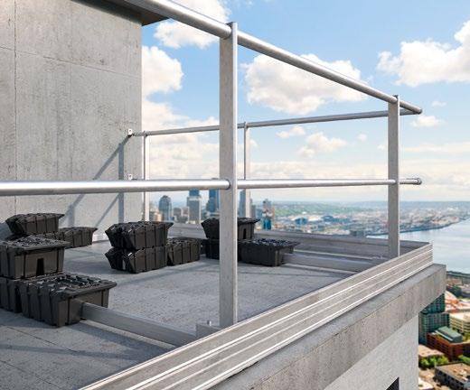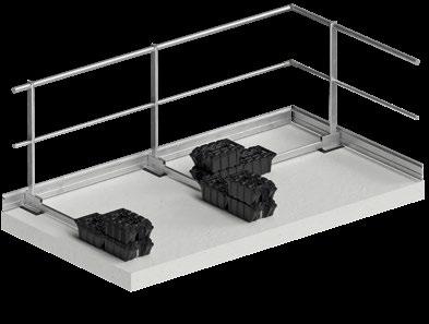 Sistema de protección colectiva para cubiertas planas, que se puede instalar sin agujeros en la subestructura. Compatible con superficies de C20/25, CLT, lámina o PVC. Compuesto por montantes, pasamanos, barra intermedia, base y lastres. Montaje rápido mediante encastres y tornillos para el rodapié. BARANDA