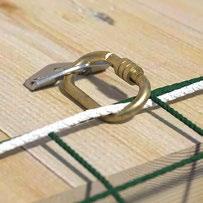 Sistema completo di moschettoni e fettucce per il fissaggio. Messa in tensione del sistema facile e veloce, realizzabile da un solo operatore mediante sistema a nodo Prusik e dispositivo autobloccante.