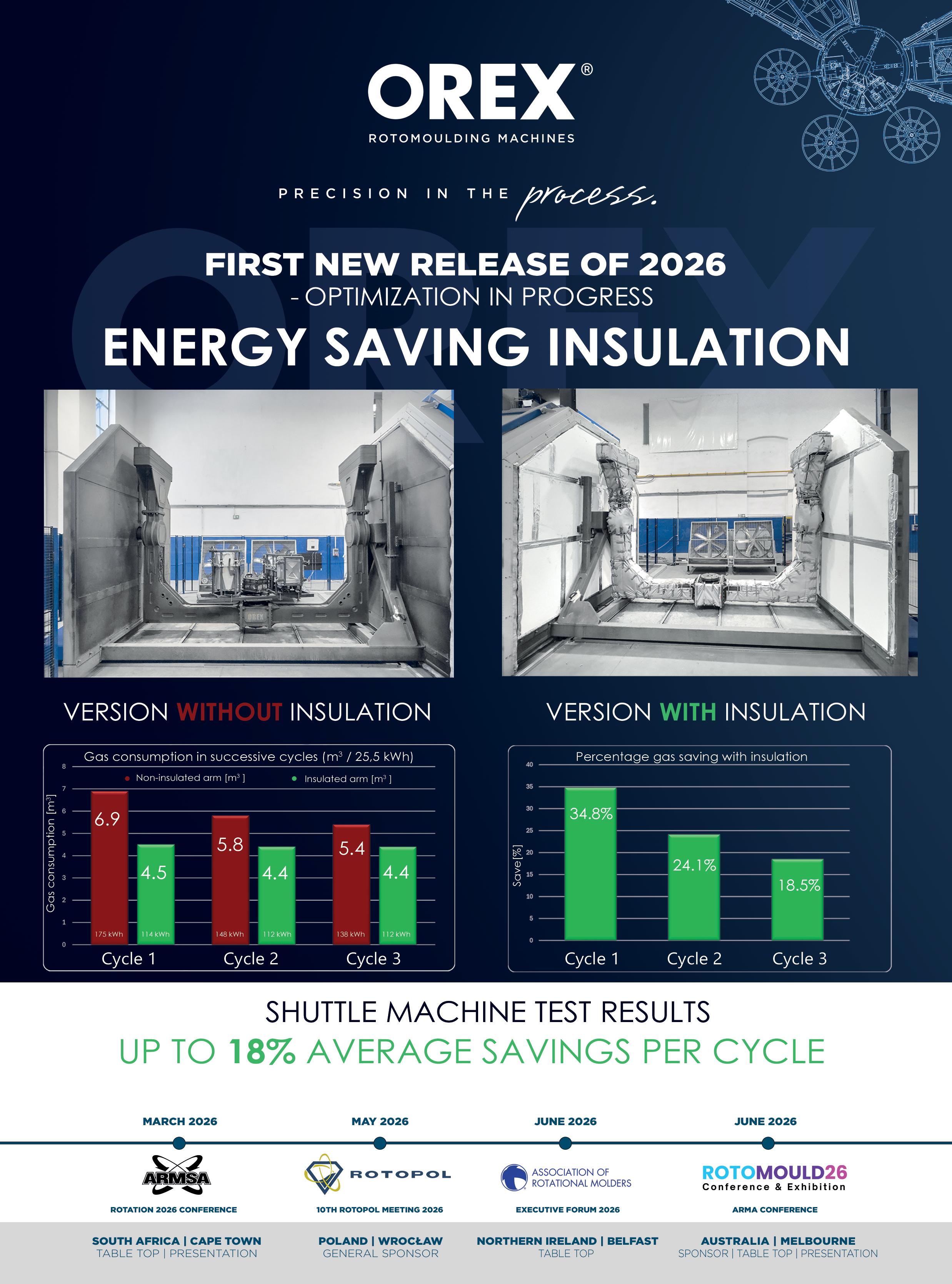 Presentations from OREX ROTOMOULDING and Rotomachinery Group highlighted that converting traditional ovens to fully electric heating is mainly viable in regions with low electricity prices or own generation. However, electric heating significantly reduces temperature overshoot during the heating phase, which ultimately results in faster cooling and shorter cycle times.