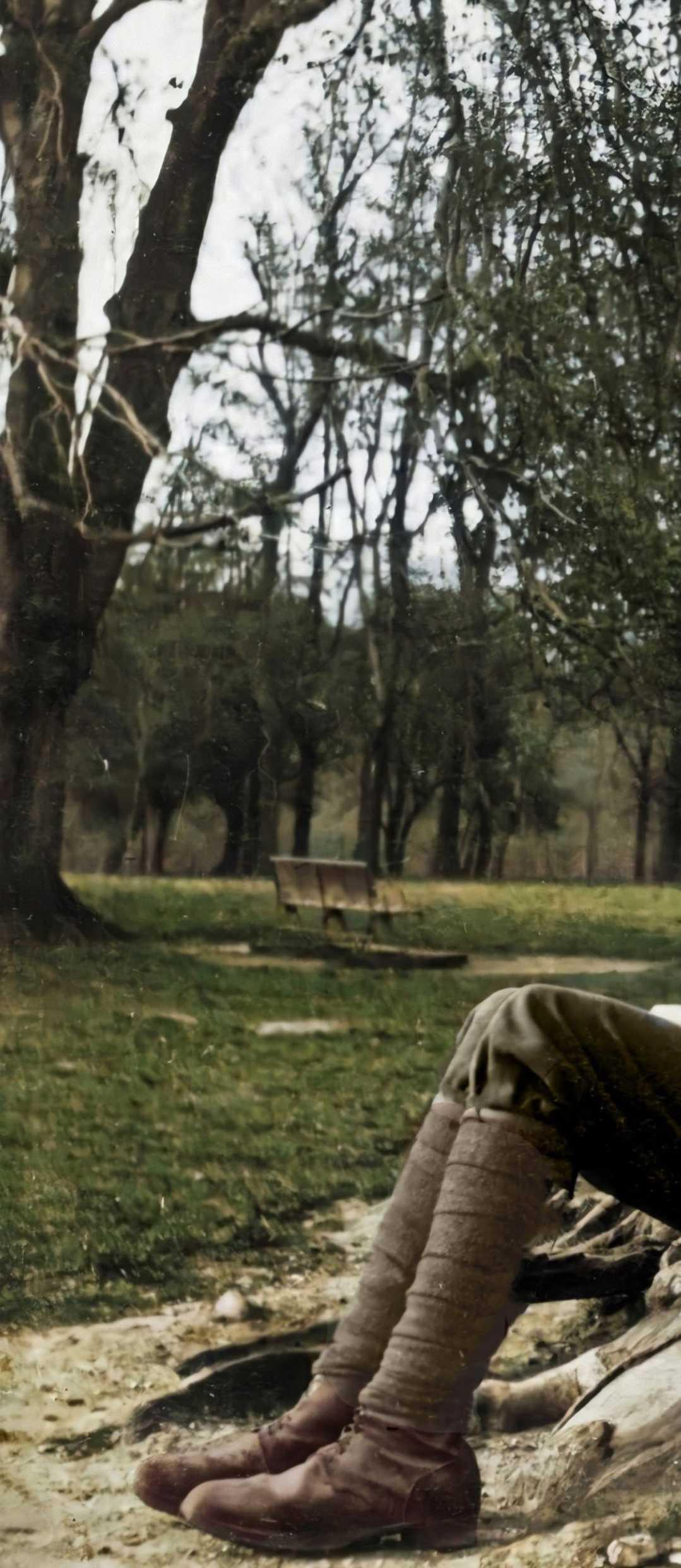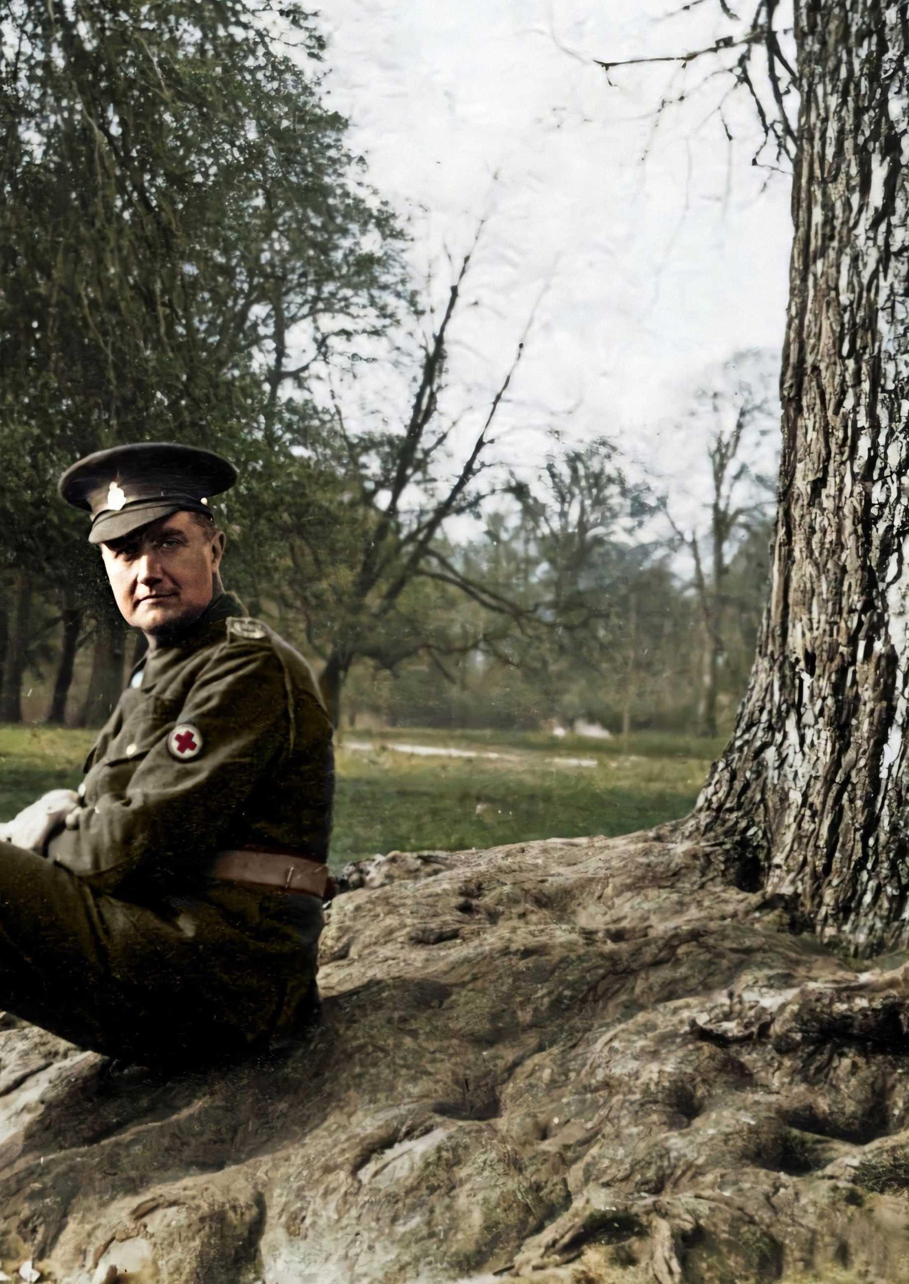 Ralph Vaughan Williams in het uniform van de Field Ambulance Unit tijdens zijn training in Saffron Walden, 1915. Ingekleurde foto, coll. Vaughan Williams Charitable Trust