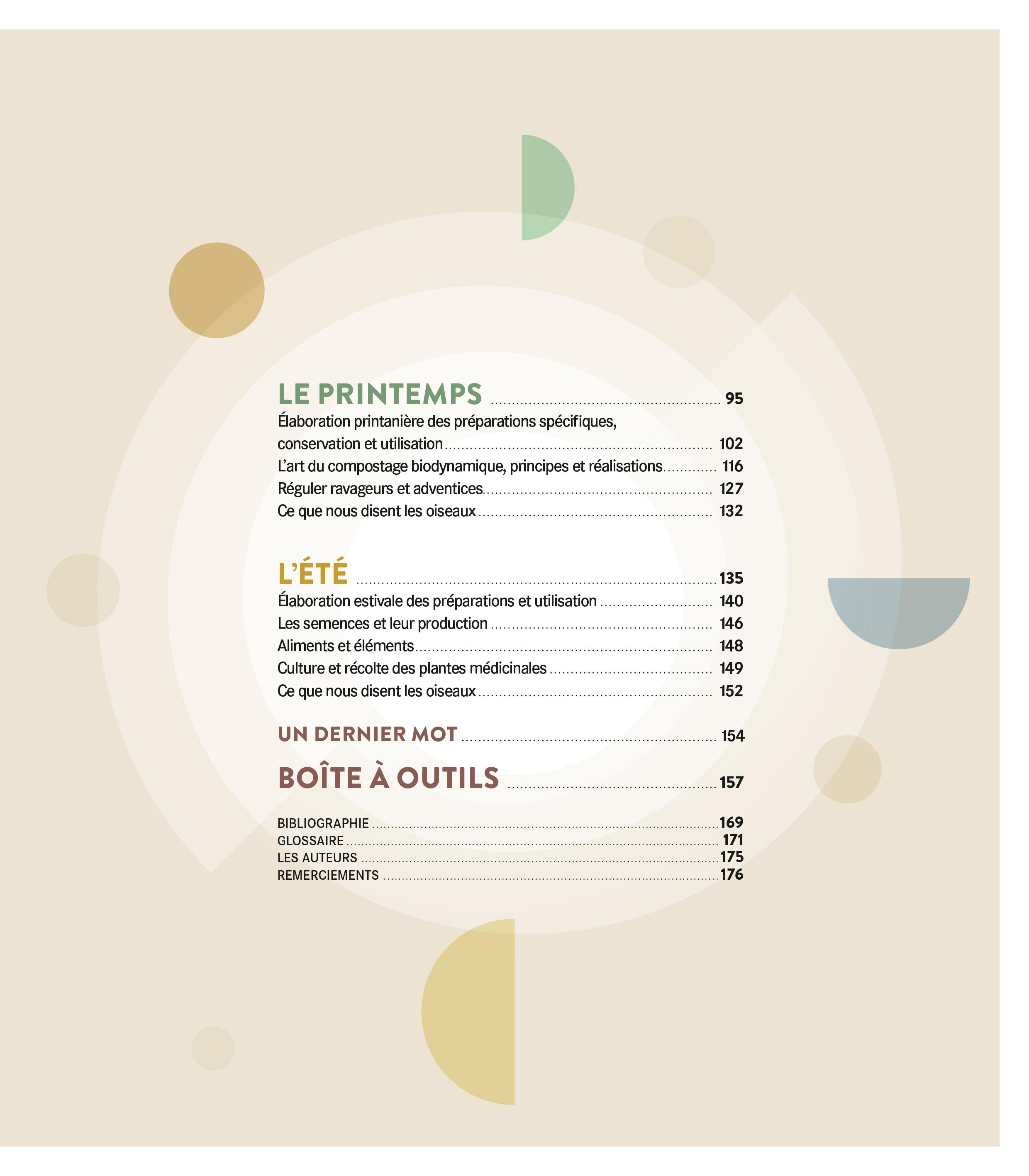 Nous vous proposons dans cet ouvrage une découverte des bases de la biodynamie ainsi qu’un accompagnement dans sa pratique quotidienne, pas à pas au fil des saisons, comme l’almanach de nos grands-parents en quelque sorte. Nous vous guiderons dans les gestes techniques, les observations pratiques et tous les petits riens qui font que ce travail de la ferme ou du jardin devient un grand tout !