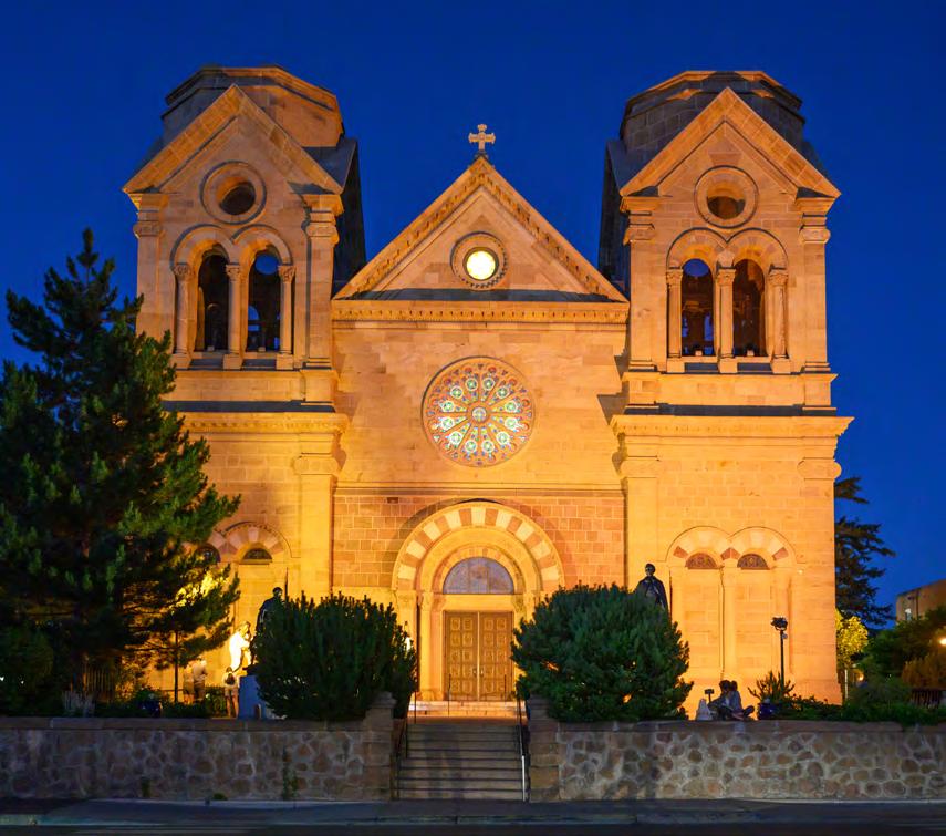 Santa Fe’s architecture is defined as much as it is dominated by the Pueblo style. Earthcolored adobe, raised into low buildings with flat-topped roofs, that remind us of the long standing Native American presence in the area, that far predates any European settlement. However, one building stands out notably from the city’s skyline: a Romanesque structure of limestone with beautiful, towering stained-glass windows. The Cathedral Basilica of St. Francis of Assisi, located right in the heart of downtown Santa Fe since 1886. The story of this church, though, extends far back beyond its completion in the late-19 th Century, starting with the first arrival of the Spaniards into the then Mexican territory of Nueve Mexico, securing what would become Santa Fe as their territorial capitol.