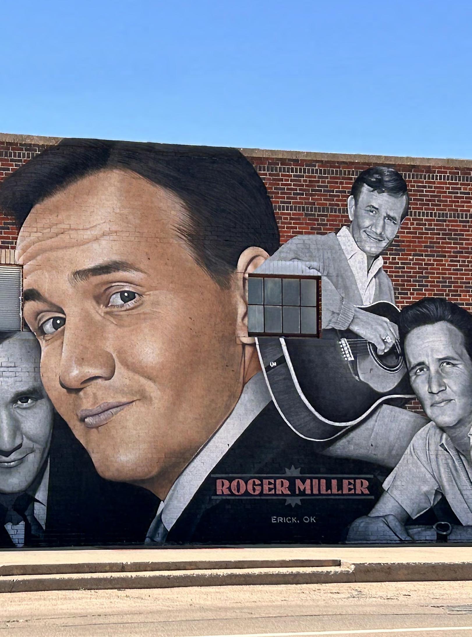 Erick, Oklahoma, with a population of just under a thousand residents, is a modest historic town. One of its most notable claims to fame, however, is its connection to country music legend, Roger Miller, a bond the town celebrates with a mural of the witty country star. The mural adorns the side of a 1929 building located at the corner of Roger Miller Blvd. (aka Route 66) and Sheb Wooley Ave. The latter street is named in honor of Sheb Wooley, a fellow country-western legend and Erick native who had a profound impact on Miller’s early years. The brick building once housed a café and drugstore, and it later became home to the Roger Miller Museum until its closure in 2017, due to financial difficulties. Today, the building operates as a flower shop.