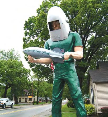 Texaco Inc. especially pushed their hardest, requesting 300 fiberglass 25-foot-tall “Big Friend” statues. Black-andwhite video commercials featuring an actor interacting with a car model — advocating for generous, quality car service — emerged, emphasizing the Big Friend service aspect of the brand. Donning a black service jacket, brimmed cap, and jovial grin to tend to travelers’ beloved automobiles, they were the first of what would be later dubbed Muffler Men.