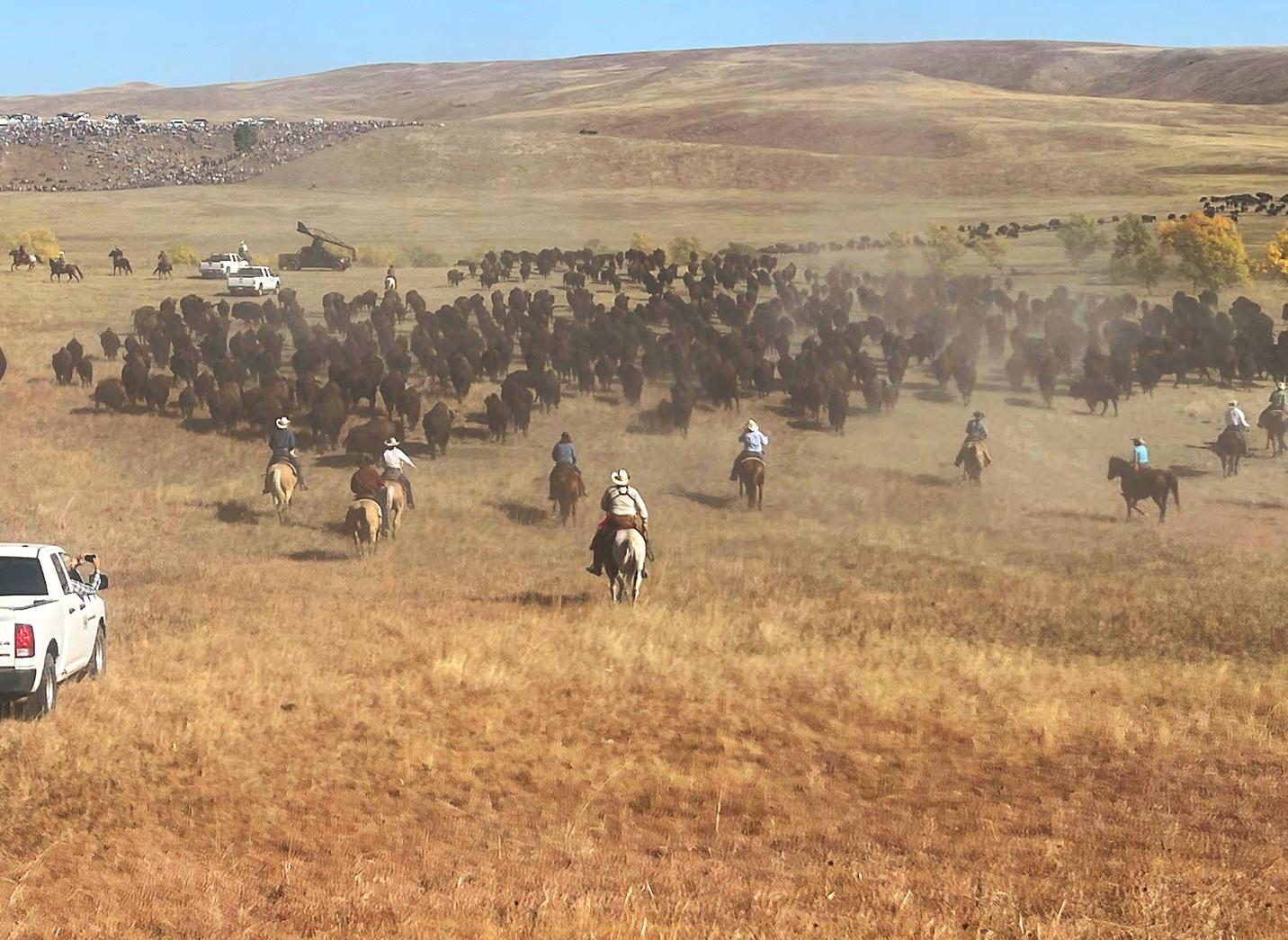 The horses were antsy to get started. Finally, the calls go out and the cowboys and cowgirls start whistling and cracking their whips, the calls of “Yaw!” and “Come on, cow!” Then the thunder of 1,300 running buffalo, breaking through the quiet morning air.