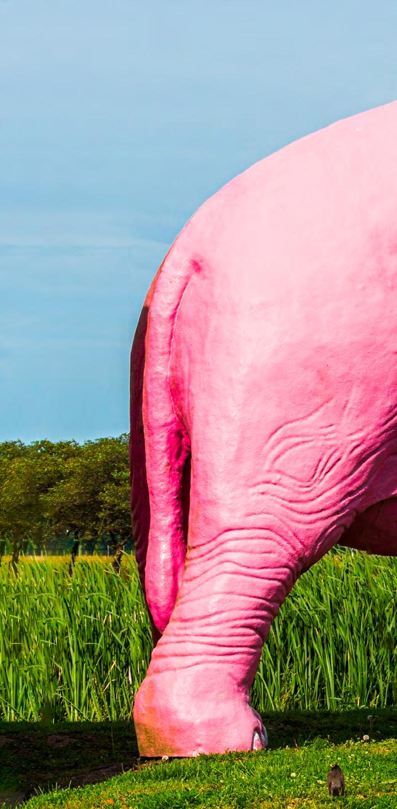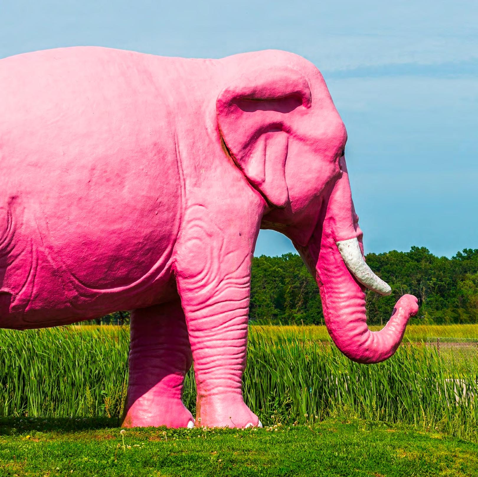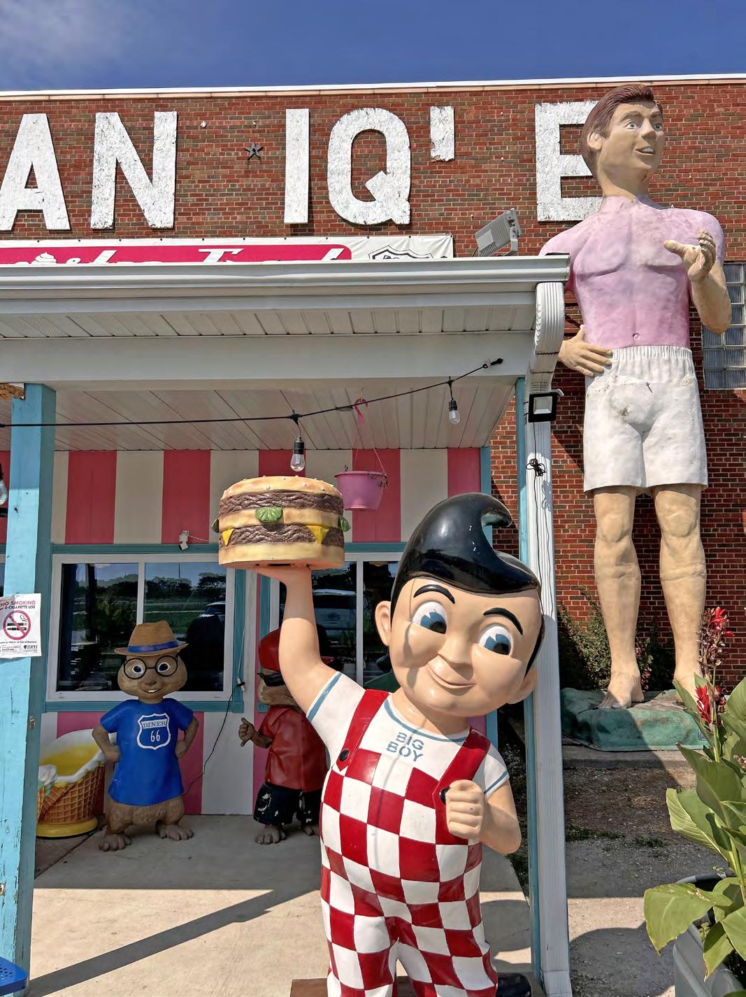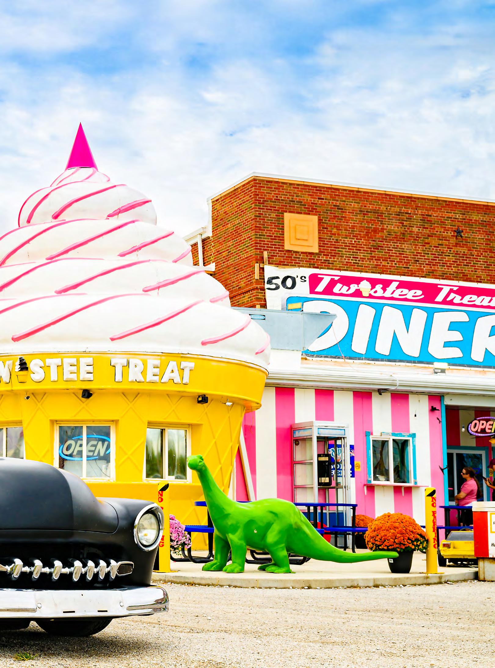 A roadside tribute to weird and wonderful Americana, the Pink Elephant Antique Mall in Livingston, Illinois, is a can’t-miss stop on Route 66. Housed in a former high school, this 30,000-squarefoot treasure trove offers vintage oddities, classic candy, and even a retro diner. But the real magic is outside, where a huge pink elephant, numerous fiberglass giants, and a flying saucer turn nostalgia into a roadside spectacle worth the detour.