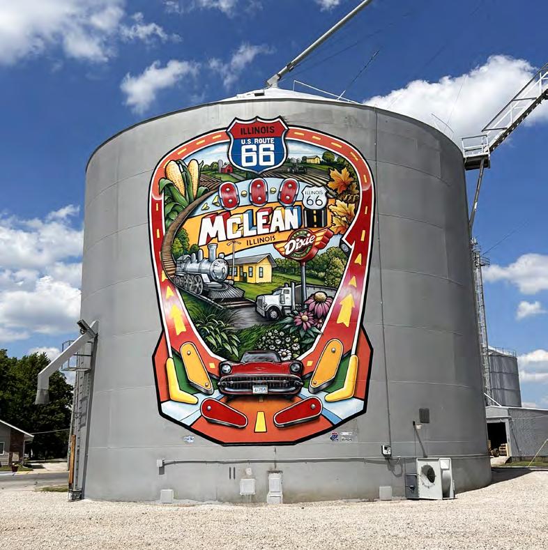 But Freeman was no stranger to honoring the Mother Road. His work adorned downtown walls and museum interiors, including the Route 66 in McLean County mural at the McLean County Museum of History, The Villas of Holly Brook mural in Springfield, and the striking Lincoln’s Lost Speech mural in downtown Bloomington. But this time, he faced a more unusual canvas: a towering, unusually smooth grain silo located on Morgan Street, directly across from McLean Christian Church. Its wide, cylindrical surface called to him, and Freeman knew instantly that it was the perfect tribute spot.