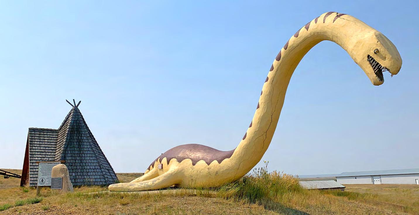 We were cruising west under an impossibly blue prairie sky, the kind that makes the horizon seem endless, when we rolled into blink and you’ll miss it, Ponteix. And there he was: Mo, the Plesiosaur. Towering beside the road, Mo’s long neck and smiling face were impossible to miss. He was incredibly loveable and nothing if not DIY. This prehistoric marine reptile wasn’t just a fibreglass curiosity; Mo was inspired by real history. In 1992, local farmer and amateur fossil hunter Peter Hryciuk uncovered the fossilized remains of a Plesiosaur near Ponteix. This remarkable find, thought to date back 70 million years to a time when the prairie was a vast inland sea, captured the imagination of the small town.