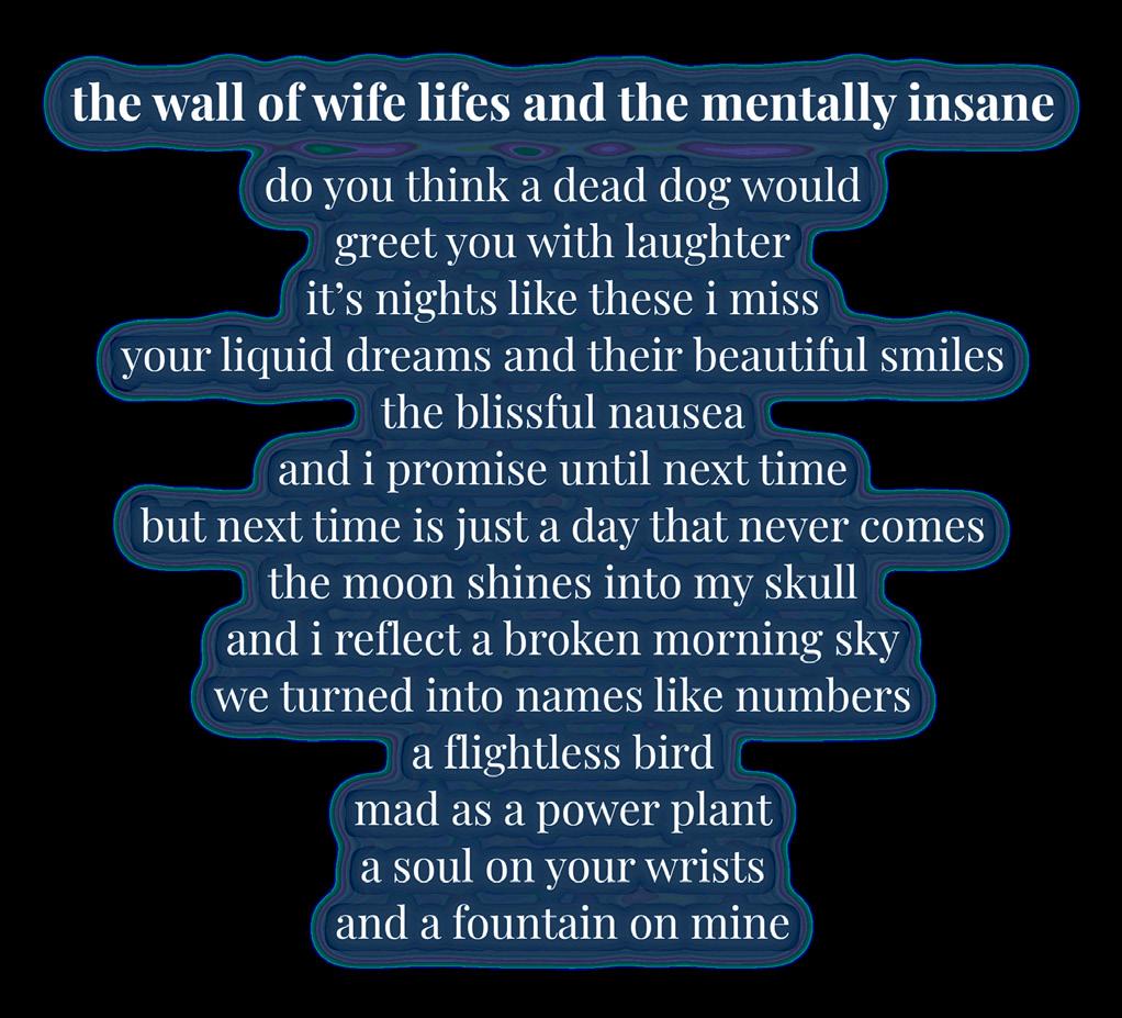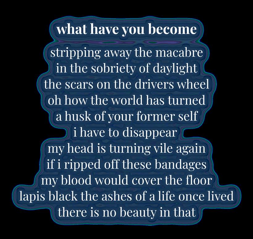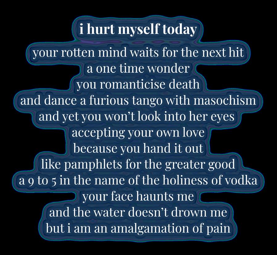 Everything seemed so loud, so heavy The reflection on t seem like a real human being, more like a deconstructio of raw flesh and bones A headache takes over the thin the mouth of the Body just gurgles incomprehensible wo Clothes, often black or white, or a rare palette of plain pulled over the head, stuck there for a few seconds, bef violently pull them further in