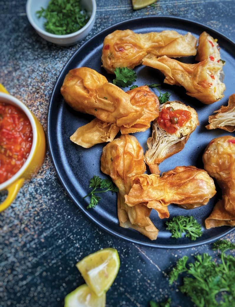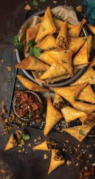 Fried pap balls covered with spring roll pastry, served with tomato relish Peri-peri chicken wings Veda Bacon & mashed potato phyllo tart Bhajia Baked camembert delight 111 113 114 116 117 120