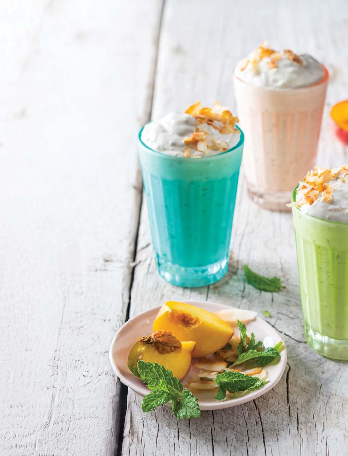 2. Blend until smooth, pour into glasses and garnish with fresh mint.