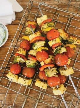 4. Thread the halloumi and vegetables onto 6 skewers. If you are using wooden sosatie sticks, make sure to soak them in water for at least 30 minutes first, so they do not burn when cooking.