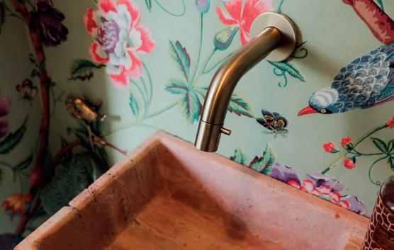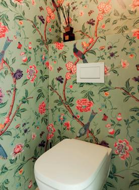 Na de levendigheid van familie en vrienden vinden John en Min rust in hun thuiskantoor, aangevuld met een gezellige leeshoek met zicht op de tuin. De warme, donker gebeitste eikfineer van de boekenkast zorgt voor een herkenbare lijn in het interieur. Dankzij de grote schuifdeur blijft de openheid tussen living en keuken behouden wanneer gewenst. In de inkomhal zorgt het gastentoilet voor een speelse noot, met een verfijnde travertin wastafel en charmant vogeltjesbehang dat meteen een glimlach oproept.